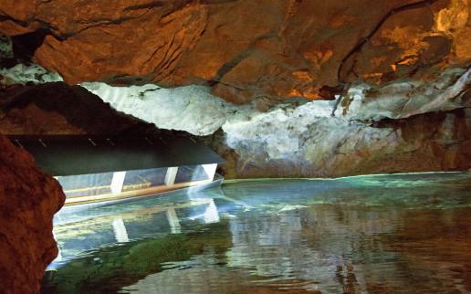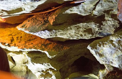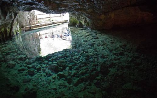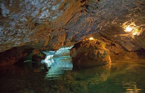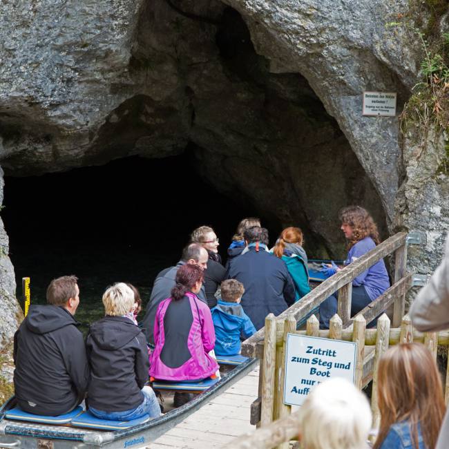 Da es bereits halb fünf war, war der Andrang spärlich. Wir konnten das 17.15 Uhr Schiff besteigen. Ein Boot war für die Hochzeitsgesellschaft, das andere für die normal sterblichen Gäste. Es war schon beeindruckend. Man musste sich oft zusammenkauern im Schiff, damit der Kopf ohne Schrammen davon kam. Nach der Einfahrt lag links ein Schiff, gefüllt mit Christstollen, gesichert mit einem Gitter. Eine vorzügliche Lagerung bis Weihnachten. Die Wimsener Höhle ist die Quelle der Zwiefalter Ach. Sie befindet sich im Glastal, die Glas fliest nur 50 m vom Höhleneingang in die Ach. Sie ist die einzige mit dem Boot befahrbare Schauhöhle Deutschlands. Nur rund 70 m der Höhle werden bei der Führung mit einem Holzkahn für max. 12 Personen befahren. Dann taucht die Höhlendecke unter die Wasseroberfläche ab, und der Rest der Höhle ist nur mit Taucherausrüstung befahrbar. Modernere Tauschmethoden ermöglichte, dass die Höhle 730 m tief erforscht ist. Es gibt im hinteren Teil einen grossen Raum 10 m hoch, bevor es wieder enger wird. Das Wasser und die Lufttemperatur sind das ganze Jahr bei 8 °C.