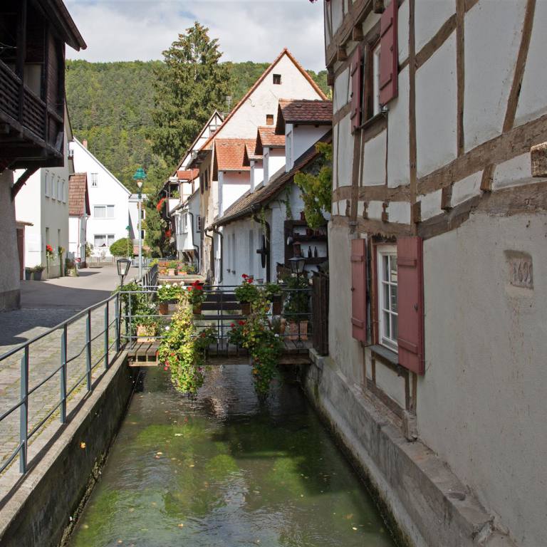 Nach einem Mittagessen im Restaurant Adler durchstreiften wir noch die Altstadt. In dem Gassen sieht man immer wieder kleine Wasserkanäle. Fachwerkhäuser an jeder Ecke ergänzen den schönen Eindruck des kleinen Städtchen. Ein Spaziergang ins Lautertal beendete den Besuch des sehenswerten Ortes. Stützen rauf und weiter geht es. Unser nächster Ort, den wir ansteuerten war Bad Urach. Etwas mehr als 30 km Fahrt wurden etwas länger. Umleitungen und dann Eingangs Bad Urach Sonntagsabend Stau verlängerte die Fahrt. Wir steuerten den Parkplatz an der Alb Therme an. (GPS: 48.500786, 9.377228) Er war gut besucht aber nicht voll. Installieren und Nachtessen war zuerst auf dem Programm. Ein Bummel durch den schönen Park der sich im Tal schlängelt wurde als Nachtspaziergang betrachtet. Anschliessend machten wir uns einen gemütlichen Abend beim fernsehschauen, jeder sein eigenes Programm.