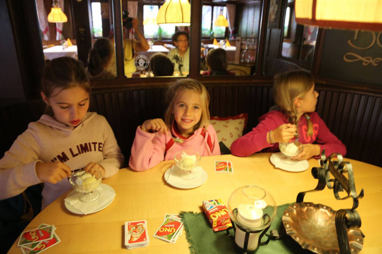Nach dem Essen spazierten wir dem See entlang nach Schluchsee. Trotz eisiger Bedingungen war ein Besuch in einem Restaurant zum Eisessen angesagt. Beim Warten spielten wir noch Uno.