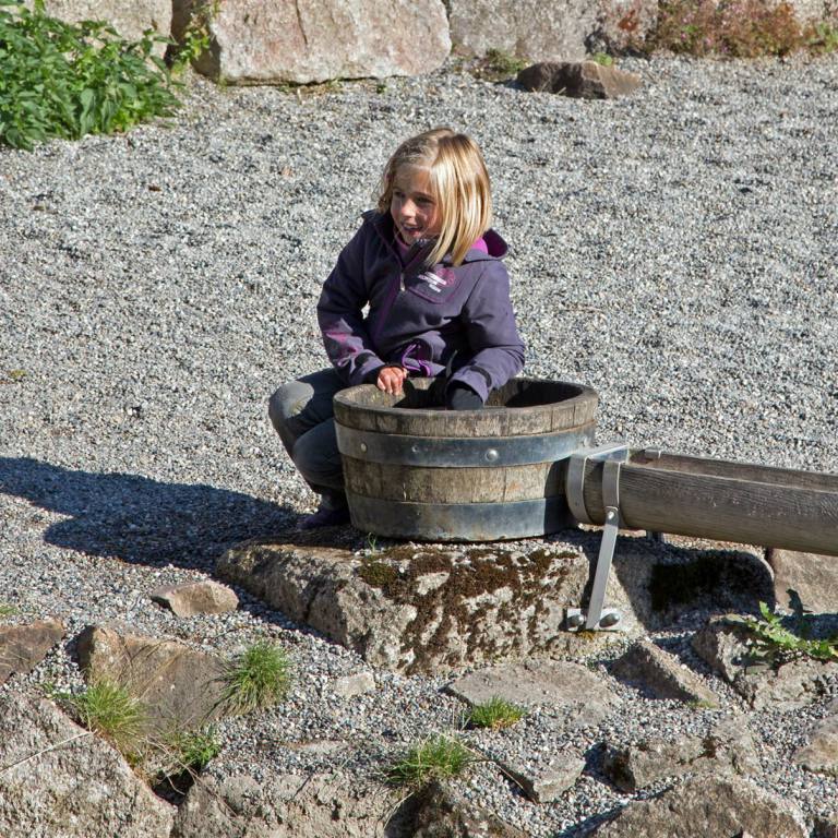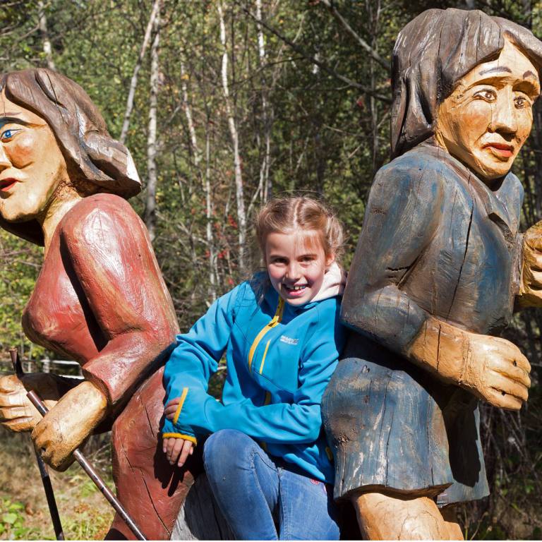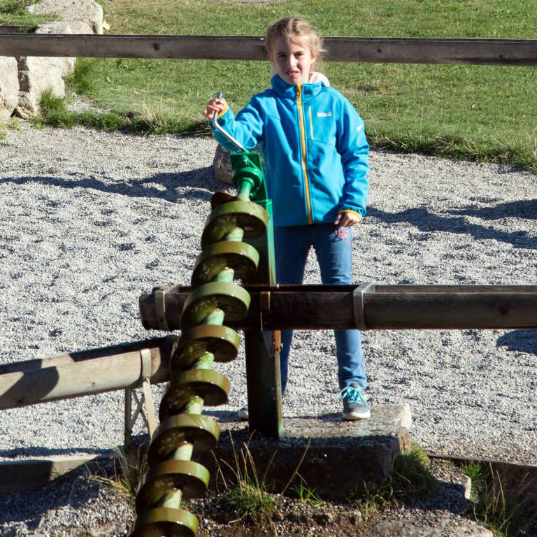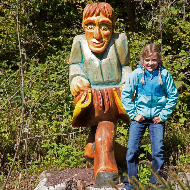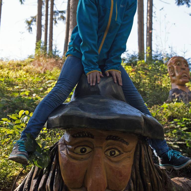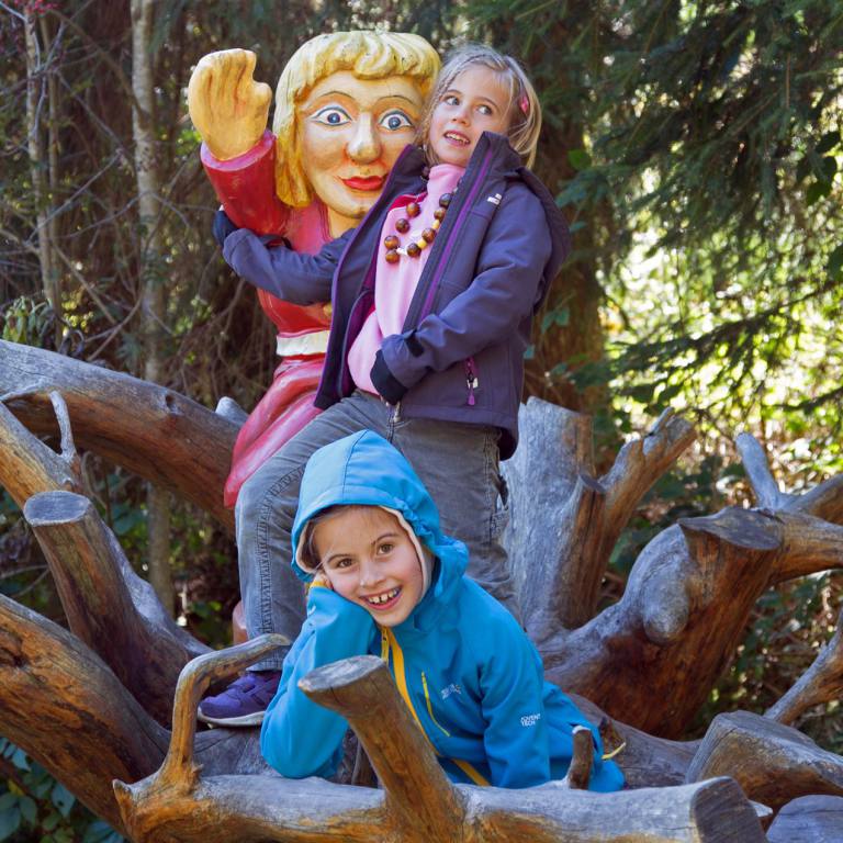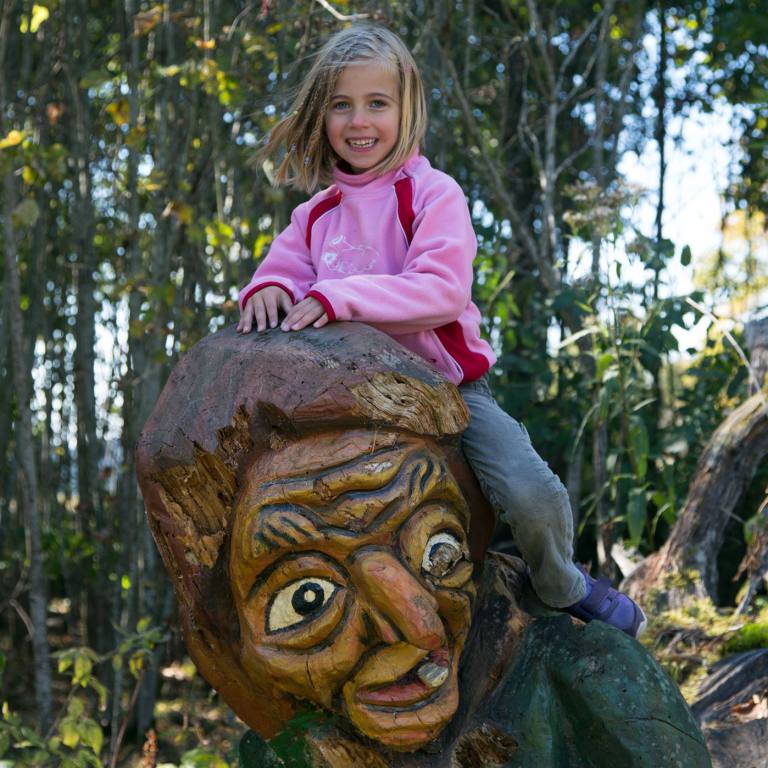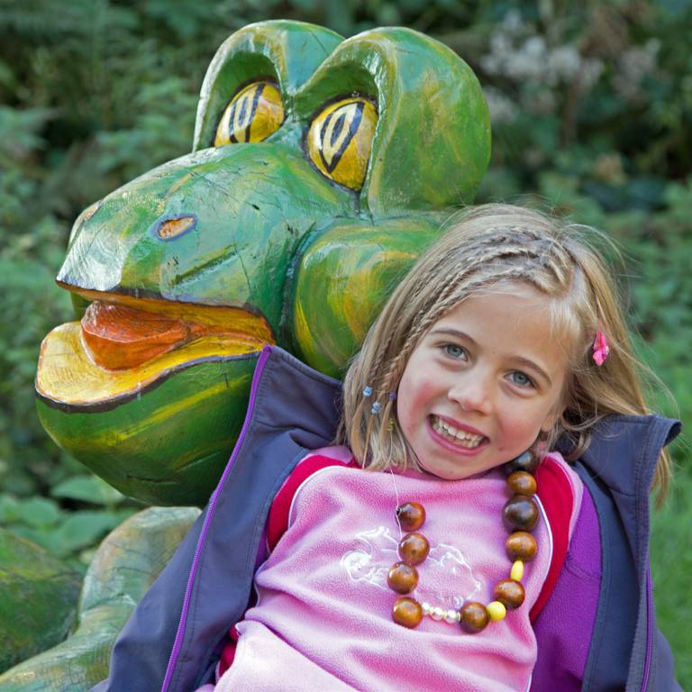 Begrüsst werden wir am Eingang des Pfades von einer furchterregenden Schlange und ulkigen Gnomen. Gleich zu Beginn ertasten wir mit unseren Füssen die Natur auf dem Barfusspfad . Wir passieren allerhand weitere Stationen, bei denen wir die Natur erkunden können. Mit Tafeln wird der Wald und seine Bewohner beschrieben. Immer wieder sind lustige Figuren zu sehen, die natürlich sofort in Beschlag genommen werden.