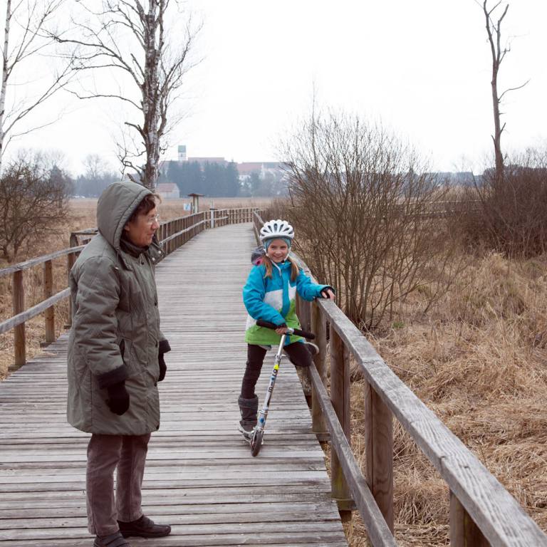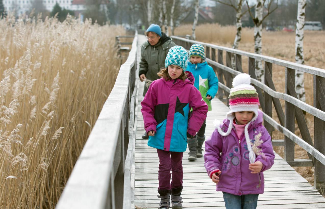 Wir befinden uns nun direkt am NABU Federseemuseum in Bad Buchau. Der Ort hat drei Stellplätze. Wir sind zur Zeit ganz alleine auf dem Platz. Heute steht eine naturkundliche Wanderung auf dem Steg ins Moor auf dem Programm. in dieser einzigartigen Moorlandschaft kam man über Naturerlebnispfade , Stege und Aussichtstürme die herrliche Natur erkundet werden. Wir liefen die 1.5 km auf dem Holzsteg bis ans Ende zum Federsee. Durch die kalte Witterung waren die Vögel noch nicht angekommen. Die Natur ist wunderschön, wäre aber mit den vielen Gefiedertieren noch schöner. So mussten wir mit wenig Tierbegegnungen den Rückweg antreten. Halb erfroren gings diesmal auswärts zum Mittagessen. Ein weiterer Spaziergang in die schmucke Innenstadt führte uns in eine Gelateria, wo die Kinder und ich ein Eis genehmigten und Mummu Kaffee und Kuchen. Als wir zurückkamen lachten die Kleinen verschmitzt. Ich sah dass ein weiteres Wohnmobil da stand. Vom ersten Blick aus dachte man es ist unser. Es war ein genau gleicher Morelo, hatte aber einen Gepäckträger. Die Kinder erzählten, dass sie zuerst dort versuchten mit dem Eingangscode ins Wohnmobil zu kommen, ehe sie den irrtum einsahen. Zurück beim Wohnmobil wurde noch etwas draussen gespielt. Schnell war es Abend und nach dem Abendessen wartete das breite Bett auf die drei Ranken.