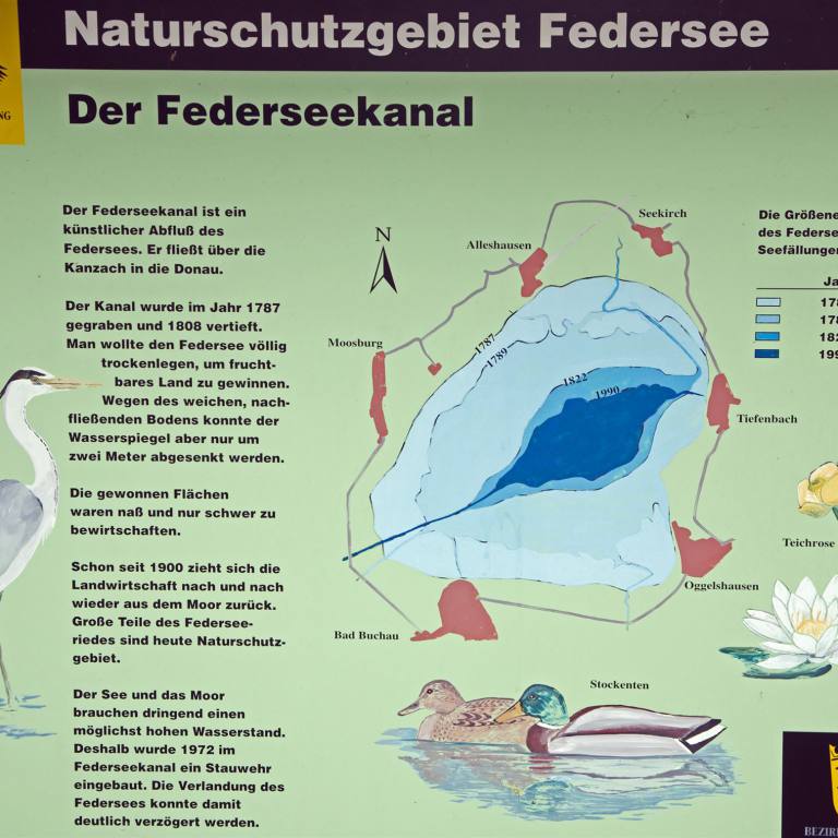Nach einem gemütlichen und üppigen Frühstück machten wir uns auf den Weg ins Naturschutzgebiet. Die Sonnen drückte das erste mal etwas durch die Wolken. Der See kann auf einem Rundkurs umrundet werden. Es sind rund 16 km, die wir aber mit den Kindern nicht bewältigen konnten. Vom Wohnmobilplatz aus durchquert der Rundweg den Moorurwald "Banngebiet Staudacher" und führt vorbei an einer Lichtung, auf der Orchideen und Eiszeitpflanzen wachsen. Durch das Mosaik an verschiedensten, eng verzahnten Lebensräumen findet eine Vielzahl an Tier- und Pflanzenarten geeignete Bedingungen am Federsee. Im See und in den Gräben leben 15 Fischarten.Als Europa-Vogelreservat bietet der Federsee 268 Vogelarten eine Heimat. Aber auch Fledermäuse finden über den insektenreichen Feuchtwiesen ideale Jagdbedingungen, so dass 12 von 25 deutschen Fledermausarten hier nachgewiesen sind.