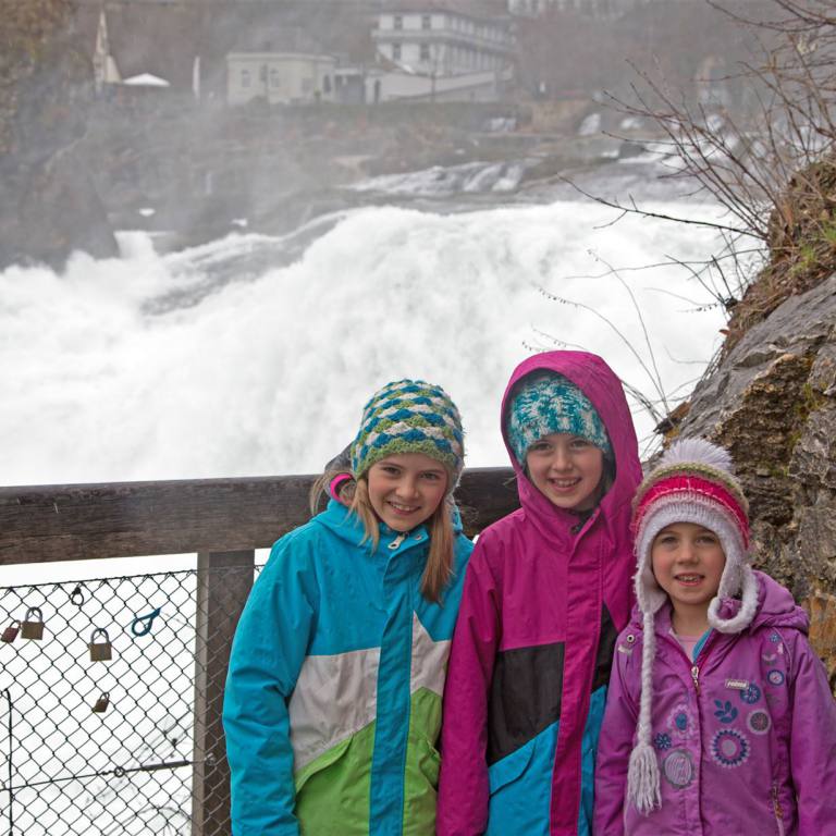 Am Donnerstag Abend kam Bewegung in die Wohnmobilszene. der Platz auf dem wir beinahe alleine waren füllte sich nach und nach. Als wir aufwachten war kein einziger Platz mehr frei. Das Osterwochenende begann. Wir wollten nach dem Frühstück aufbrechen zumal es auch zu Regnen begann. Kaum aus dem Platz herausgefahren war er schon wieder belegt. Wir fuhren Richtung Überlingen und sahen am Wegesrand bei Ostrach eine Sehenswürdigkeitentafel stehen. mit der Aufschrift Grenzsteinmuseum. Was ist den das ? Neugierig machten wir den kleinen Abstecher und wurden überrascht. Es erinnert an die im Mittelalter begründeten, höchst komplizierten Grenzverhältnisse zwischen Baden, Hohenzollern und Württemberg in Ostrach sowie in Oberschwaben. Im Massstab 1:200 sind die Ortschaften und Gelände auf dem Boden aufgezeichnet. Man kann von Ort zu Ort laufen und immer wieder sich an Tafeln orientieren. Für die Kinder war die Geschichte nicht interessant, dafür aber die vielen Wege und Hügel wo man sich verstecken konnte. leider begann es zu Regnen, sodass wir uns weiter auf den Weg machten. Unser nächstes Ziel war der Rheinfall in Schaffhausen. Oben Wasser und unten Wasser. Trotzdem war der besuch lohnenswert.