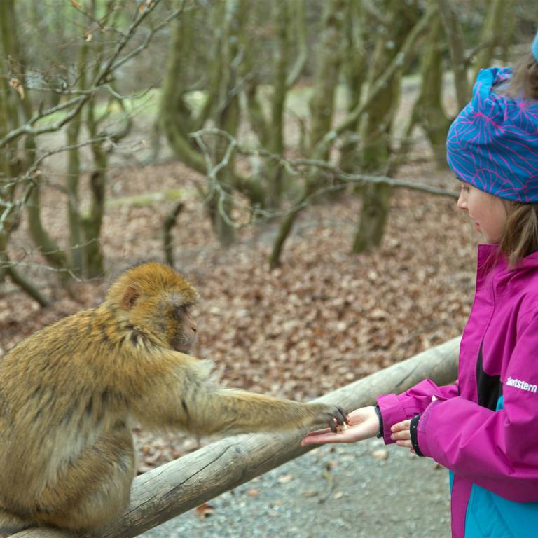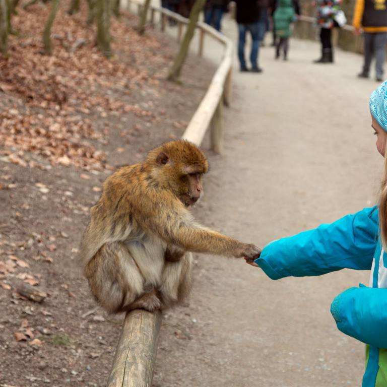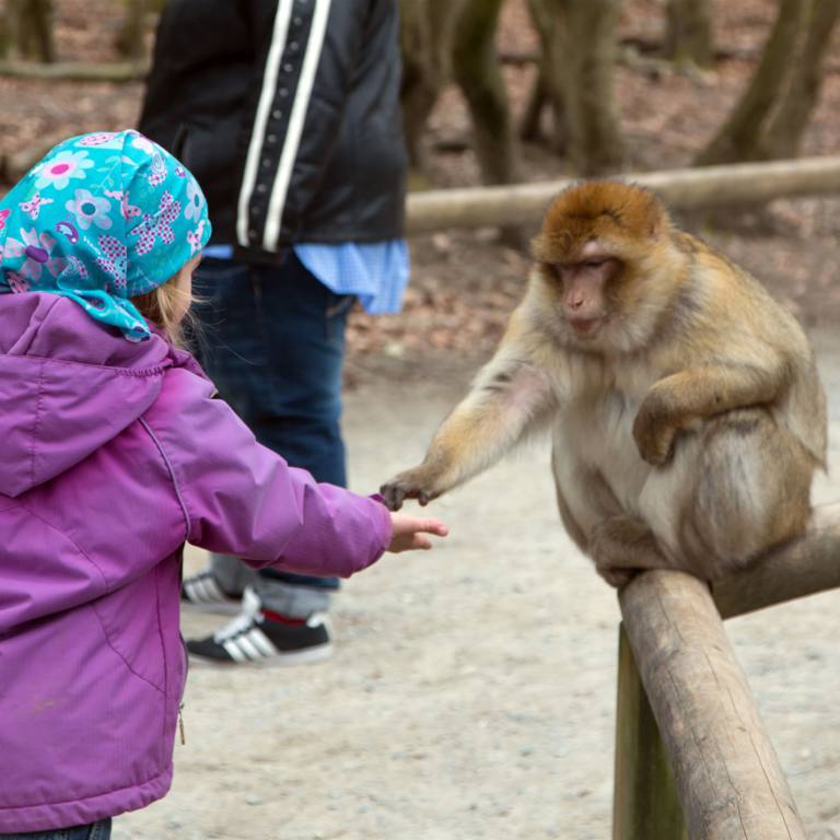 Der Park ist recht gross und liegt in einem Waldgebiet. Nach dem Eingang (Kassenhäuschen) geht es zuerst an einem Weiher vorbei. Frei fliegende Schwäne, Graugänse, Stockenten, Blässhühner, Haubentaucher und andere Wasservögel ziehen hier jedes Jahr ihre Jungen auf. Im Weiher sieht man auch riesige Karpfen vorbei schwimmen. "Wann kommen die Affen" so die Kleinste, die kaum erwarten konnte, das Haupterreignis die Affen zu sehen. Nach rund 500 m dann der Eingang zum geschlossenen Gehege der Affen. Am Eingang wurden wir zum Verhalten mit den Affen belehrt. Eine Handvoll Popcorn und schon marschierten alle gespannt den Weg entlang. Keine Affen weit und breit am Anfang. Aber plötzlich Jubel. Da vorne sitzt einer auf der Abschrankung. Wie haben wir es gelernt. Popcorn auf die Hand und ruhig entgegen strecken. Die andere Hand mit dem Rest des Popkorns hinter dem Rücken platzieren.
