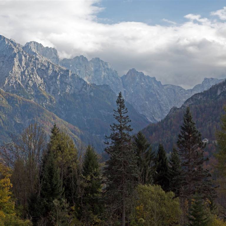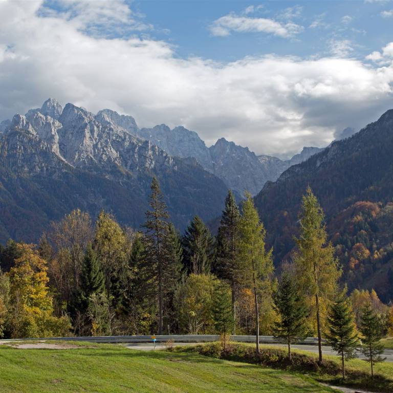 Ein wunderschöner Tag präsentierte sich beim Aufstehen. Blauer Himmel, Berge und gefärbte Wälder liessen das Herz höher schlagen. Nach dem Frühstück ging es Richtung Bled auf der gut ausgebauten Strasse über Jesenice nach Podhom. Das letzte Stück war wiederum eine kleine Bergstrecke mit 14 % Steigung und engen Kurven. Langsam fuhren wir die Strecke und glaubten teilweise nicht das wir hier richtig fahren. Ein grosser Parkplatz am Ende einer Strasse überzeugte uns aber von der Richtigkeit des Ortes. Wir wurden von einem älteren Parkwächter eingeparkt und waren schnell bereit die Vintgar Klamm zu begehen.