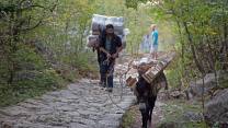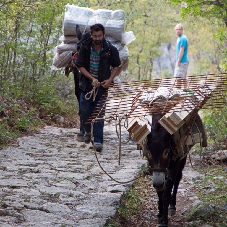 Auf dem Weg nach oben kam uns ein Train entgegen. Zwei Esel beförderten Baumaterial über den holprigen, schwer zu laufenden Weg. Einer hatte gar ein Armierungsnetz geschultert.