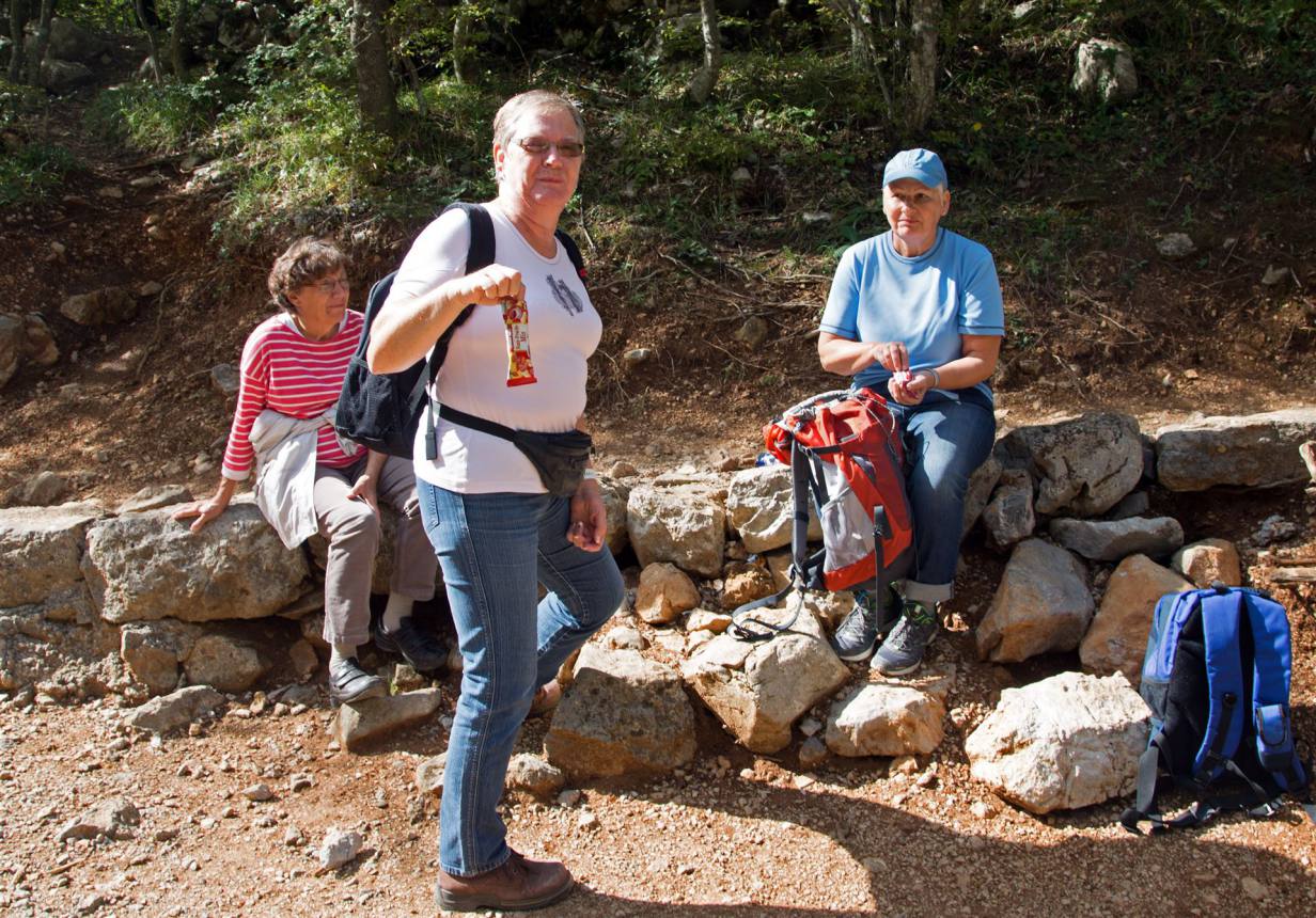 Beim Aufstieg staunten wir immer wieder über die Karstformen, die aus Dolomit und Kalkstein bestehen. Erstaunenswert ist ebenfalls, dass aus den Steintrümmern Bäume und Sträucher wachsen. 2/3 der Parkfläche ist mit Wäldern bedeckt. Buchen und Schwarzkiefer sind die hauptsächlichsten Bäume. Nach rund drei Stunden drehten wir um, da der Rundweg weitere drei bis vier Stunden in Anspruch genommen hätte. Bei einer Rast genossen wir noch das glasklare saubere Bergwasser. Der Weg zurück war weniger schlimm als wir dachten. Trotz unebenem Weg kamen wir Müde aber ohne Beschwerden wieder zu unsrem Ausganspunkt zurück. Wir nahmen einen Seitenweg zur Strasse und verliefen uns prompt. Die Suche nach dem grossen Wohnmobil erforderte eine zusätzliche halbe Stunde und einige Meter Weg. Wir waren glücklich endlich wieder ein Fahrzeug unter dem Hintern zu haben. Wir fuhren die vier Kilometer zurück. Rolf und Fredy waren nicht untätig geblieben. Sie bereiteten das Mittag-Abendessen vor. Wir waren glücklich nur noch an den Tisch setzen zu können und den hungrige Magen zu befriedigen. E wurde noch eine schöne Festtafel die aber nicht all zulange dauerte, da bereits die Sonne am Horizont unterging und es kühl wurde. Wir haben einen anstrengen aber wunderschönen weiteren Tag in Kroatien geniessen könne.