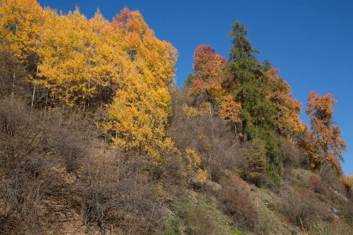 Ohne Eile machten wir uns fertig zur letzten Fahrt unserer Reise. Es war wiederum ein schöner Tag und sicher mit schönen Aussichten verbunden. gegen 10.00 Uhr zogen wir los Richtung Ofenpass. Der Verkehr war gering sodass wir langsam aber stetig stiegen. Die Autos die sich hinter uns sammelten liessen wir von Zeit zu Zeit passieren. Wir wollten auf dem Pass ein Kaffee nehmen. Pech gehabt alles schon geschlossen. Also zogen wir weiter Richtung Fluelapass. Dazwischen machten wir einen kleinen Halt zum Fotografieren. auch hier waren die Bäume bunt bemalt.