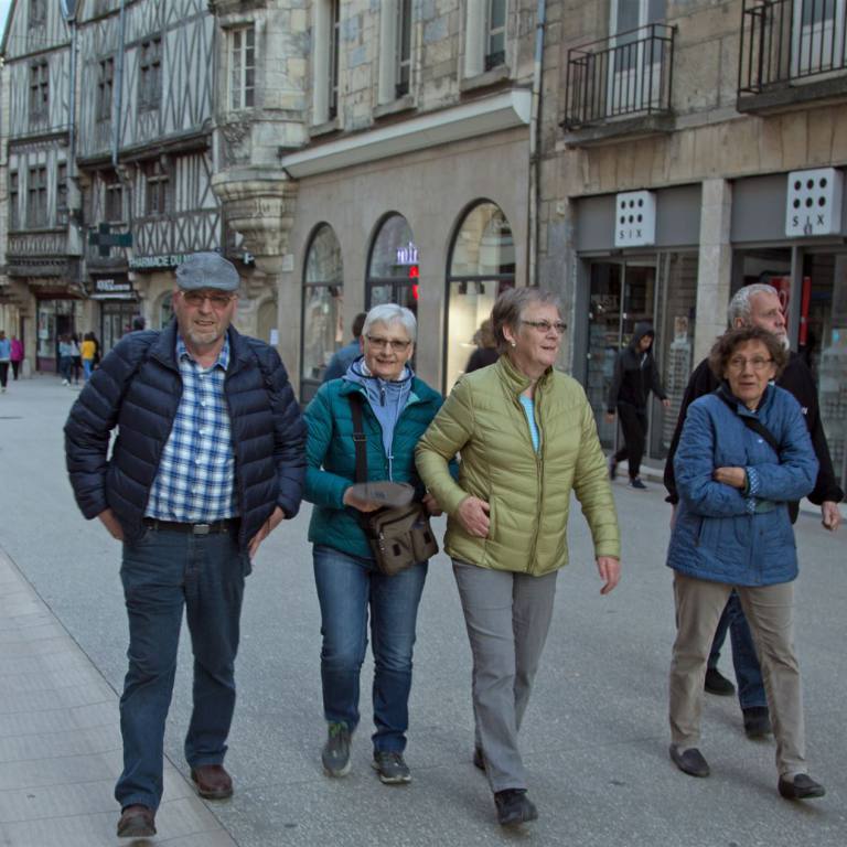 Wir schlenderten in der Halle und kaufte französische Leckerbissen. Wir trennten uns anschliessend, sodass jeder noch selbst Geschäfte nach seinem Gusto aussuchen konnte. Nach einem weiteren hervorragenden üppigen Mittagessen ging ich mit den drei Frauen auf Besichtigungstour in der Stadt. Die Fußgängerzone von Dijon ist umringt von mittelalterlichen Häusern, Kirchen und Stadtpalästen aus der Renaissance. Der Architekt Hardouin-Mansart legte die Place de la Libération an, die zu den schönsten Plätzen Frankreichs gehört. Es gibt einen markierten Weg ( Im Boden eingelassene Metallwegweiser). Der Rundgang Parcours de la Chouette führt Sie zu 22 Sehenswürdigkeiten im denkmalgeschützten Teil Dijons.
