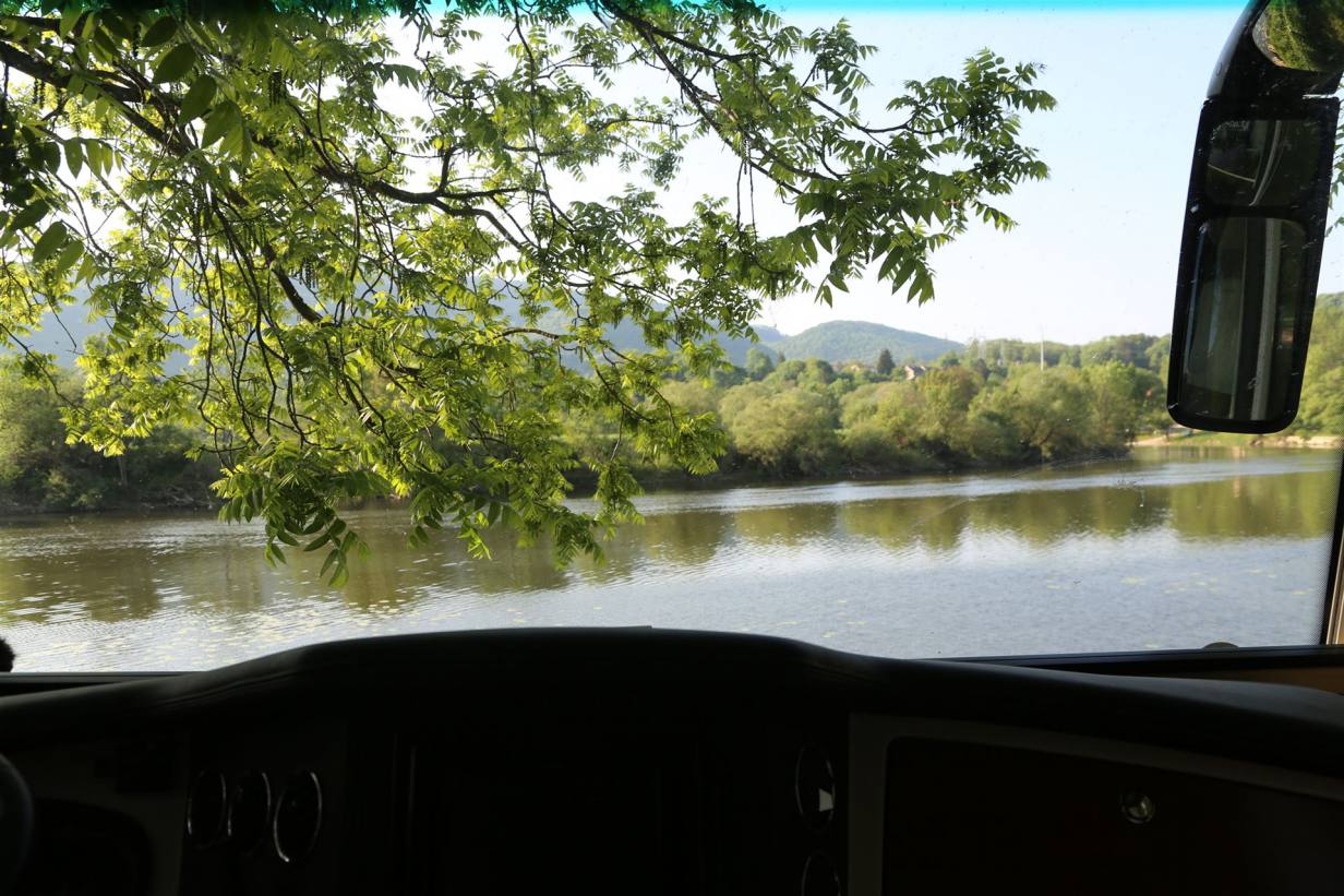Wie immer um ca. 09.00 Uhr fuhren wir weiter zu unserem letzten gemeinsamen Ziel. Die Fahrt bei schönstem Wetter und wolkenlosem Himmel ging wiederum durch viel schöne Natur zum Teil der Saône entlang. Über Berg und Tal erreichten wir auf guten Strassen gegen Mittag den Campingplatz von Besançon. Er liegt etwas abseits des Ortes. Wir hatten Glück, der Betreiber des Platzes wollte gerade Mittagspause machen. Er liess uns noch rein und wir suchten ein schönes Plätzchen. Alle drei Standen am Schluss direkt am Fluss mit Sicht auf eine Burg.