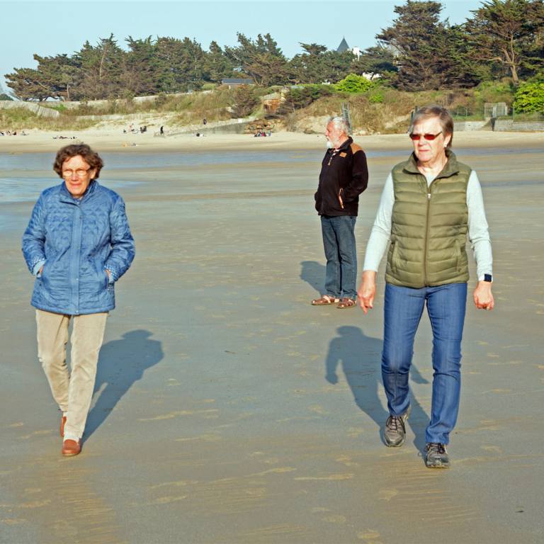 Strahlender Sonnenschein weckte uns heute Morgen. In der Nacht hatte es einmal leicht geregnet. Umso schöner war der Morgen mit blauem Himmel. Fast Pünktlich wie immer fuhren wir, nachdem alle entsorgt hatten, weiter nach Ploemeur. Dies dauerte etwas mehr als eine Stunde. Der Ort liegt nicht gerade am Meer und war zudem für Fahrzeuge über 3.5 t gesperrt. Also fuhren wir ein Stück weiter zu einem Badeort der Larmor Plage hiess. Wir konnten ideal parkieren und waren direkt am Strandweg. Zu Fuss spazierten wir dann dem Meer entlang. Am Starnd war eine Gruppe Leute mit Neopren Anzügen, die sich aufwärmten. Nachher gingen sie ins Wasser und wateten den Strand entlang. Wahrscheinlich eine Art Aquafit. Sie liefen jedenfalls mehr als 1 km bis zu den Unterarmen im Wasser den Strand auf und ab. Wir setzten unsere Wanderung fort und genossen den sonnigen Morgen in einem Kaffee mit Meerblick.