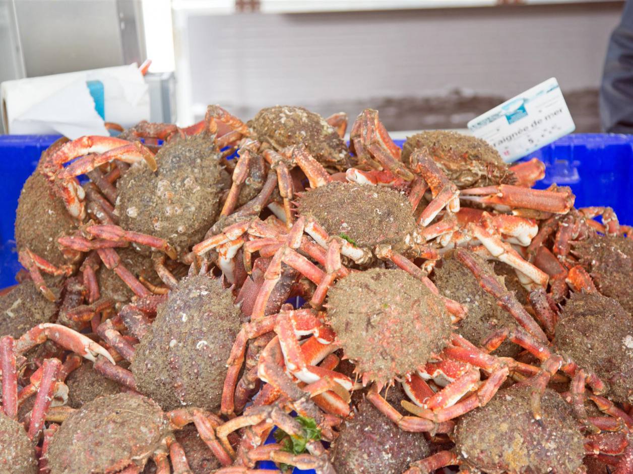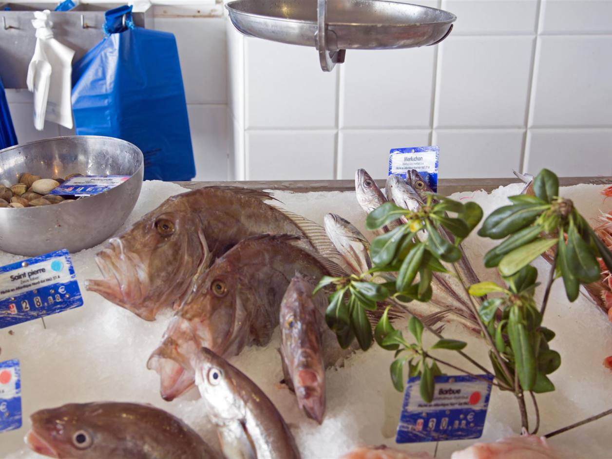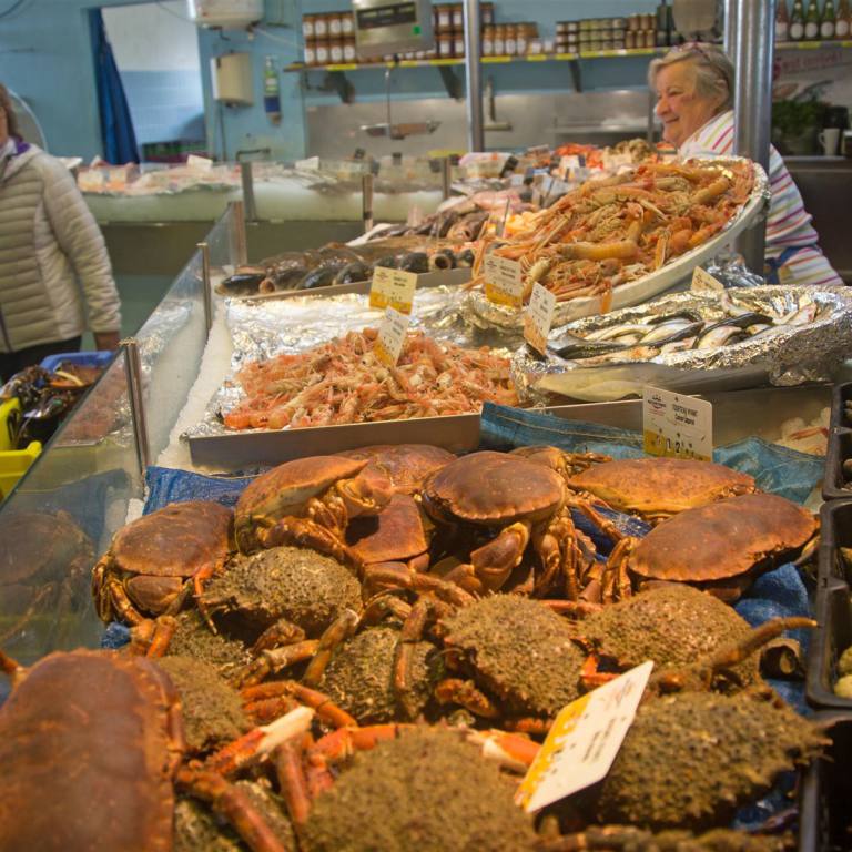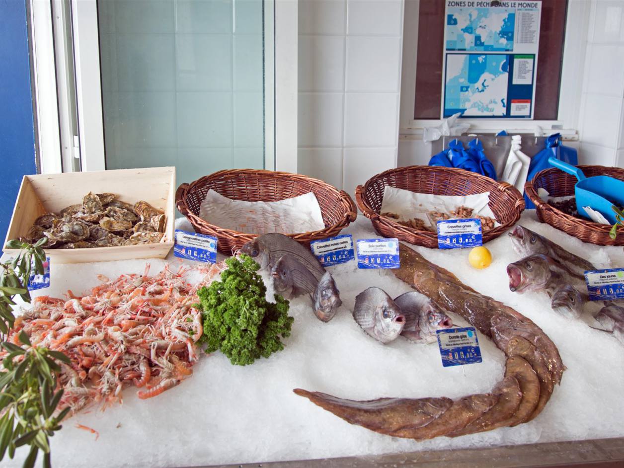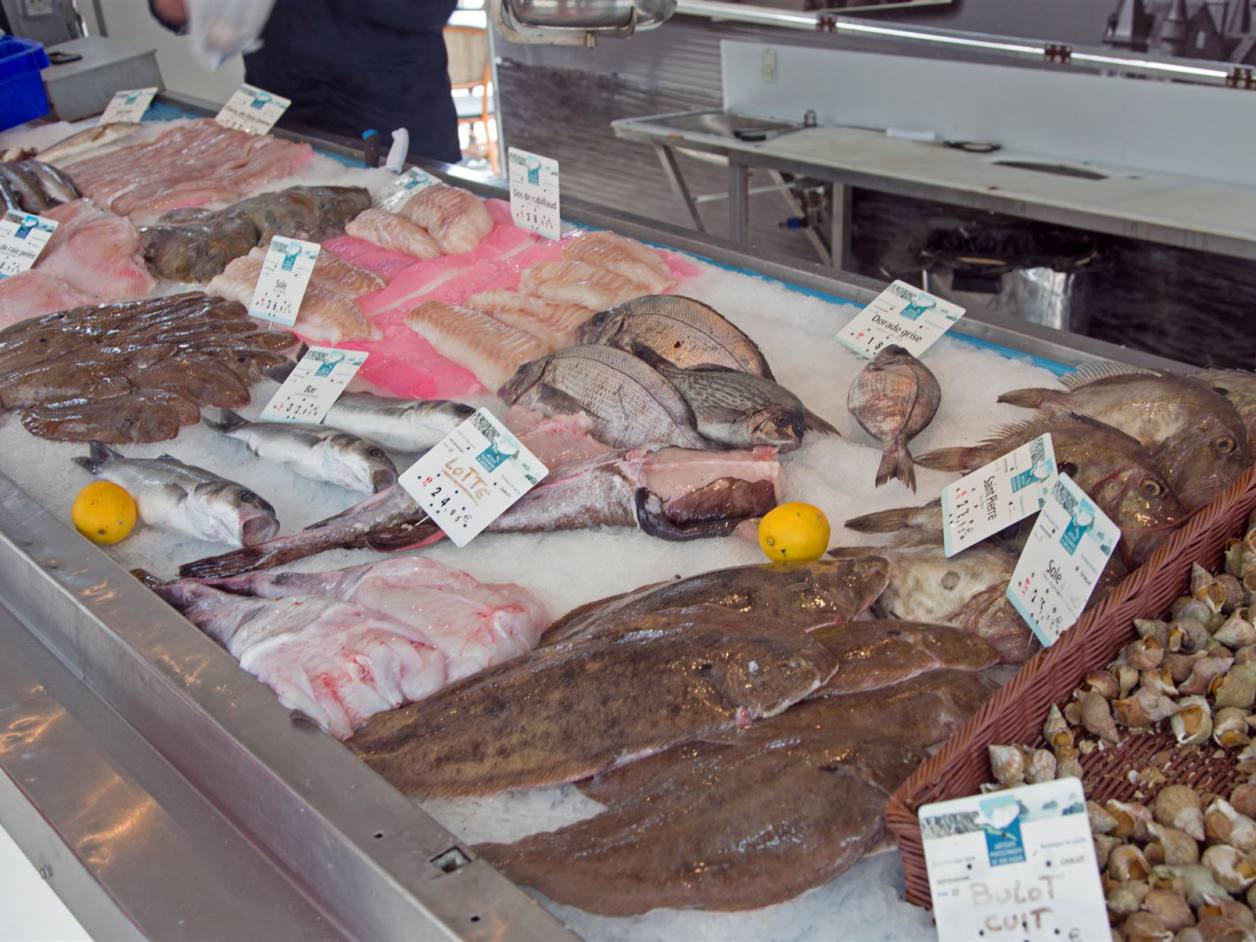 In der Nacht hat sich das Wetter massiv verschlechtert. Zum ersten mal hat es am Morgen kurz stark geregnet. Es herrschte ein starker Wind. Das Meer ist sehr unruhig. Nun ist es mir verständlich warum die Küste Coste Sauvage heisst. Es ist tatsächlich eine sehr wilde Küste. Die Wellen schlagen an die Felsen. Wir haben uns gestern entschieden einen Ruhetag einzulegen und am schön gelegenen Stellplatz zwei Tage gelöst. Am späteren Morgen sind wir nachdem wir zuvor einmal grossen Hausputz gemacht haben, zu Fuss die 1.5 km nach Quiberon gelaufen. Auf einem wunderschönen Weg abseits der Strasse waren wir relativ schnell in der Stadt. Quiberon ist eine kleine Stadt mit rund 5000 Einwohnern aber dem mehrfachen an Touristen. Es hat viele kleine Geschäfte. In einem Fischgeschäft konnte man die Vielfalt der Meerestiere sehen.