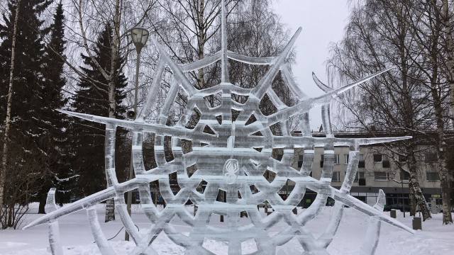 Ein weiterer grauer Tag beginnt. Es ist weiter kalt und es schneit ganz leicht. Heute wollen wir nach Mikkeli um kleine Möbel für uns zu suchen. Erkkis Frau hat uns die Stadt empfohlen, da es dort kleine Möbelhäuser gibt. Nach etwas mehr als einer Stunde ( 80 km) trafen wir in Mikkeli ein. Da es bereits Mittag waren gingen fuhren wir in die Stadtmitte um etwas zu Essen. Im Stadpark waren gerade die Siegerehrungen der Eisplastiken im Gange. Wir schauten kurz die Wunderwerke an.
