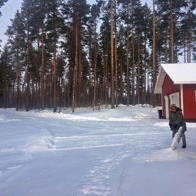 Nach einer guten Nacht genossen wir das Frühstück. Der Himmel war grau bei - 6 °C. Es hatte rund 40 cm Schnee reiner Pulver, da es immer kalt war und auch immer wieder ganz leicht schneite. Zuerst hiess es orientieren, was alles im Hause war und wie die Umgebung sich präsentierte. Zuerst stellten wir fest, dass die Garage geschlossen war und wir keinen Schlüssel hatten. In der Garage war auch das Brennholz gelagert, das wir für den schönen Ofen brauchten. Das Haus ist zwar mit einer Wärmepumpen Heizung ausgerüstet, die einwandfrei warm gibt. Ein schönes Feuer aber gibt eine andere Wärme und zudem etwas Beschäftigung. Ein Telefon mit dem Hausbauer Erkki zeigte, dass die Schlüssel anscheinend in der Garage geblieben sind. Er hat aber noch einen Reserveschlüssel, den seine Frau am Nachmittag uns brachte. Schon nach kurzer Zeit brannte ein wärmendes Feuer im Kamin. Im Gang standen noch diverse Pakete von IKEA, die seit dem Sommer nachgeliefert wurden. Ich hatte also in den nächsten Tagen Arbeit genug. Beim Aussenrundgang habe ich eine grosse Beige Holz gesehen. Erkki hat die Baumstämme die gerodet wurden um dem Haus Platz im Wald zu geben in Meter lange Stücke zersägt, abgedeckt und aufeinander geschichtet. So kann das Holz trocknen. Ich habe den Schnee zur Sauna weggeräumt und den Steg vom Schnee befreit. Anschliessend fuhren wir die 10 km nach Puumala zum Einkaufen und Essen. Am Nachmittag begann ich mit dem Zusammenbau des ersten Kleiderschrankes. Schnell wurde es wieder Zeit zum Schlafen.