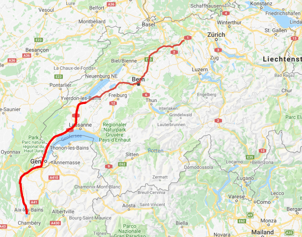 Nachdem ich das Wohnmobil bereits am Samstag bereit gestellt hatte musste wir gestern nur noch die persönlichen Sachen einordnen. Tuulia hat ihre Kleider auch zum Teil am Montag und den Rest heute Morgen eingeräumt. So konnten wir um 10.10 Uhr starten. Bei Regen fuhren wir auf die Autobahn Richtung Bern-Genf. Wie üblich hatte es beim Gubrist etwas Stau. Es ging aber schnell vorwärts. Glücklicherweise hörte es nach Oftringen auf zu Regnen. Der Himmel klarte sich immer mehr auf und schon bald schien die Sonne. Der Verkehr war mässig, sodass wir gegen 13.00 Uhr in der Rastätte Bauvais kurz vor Lausanne das Mittagessen einnahmen. Dann ging es weiter Richtung Genf. Ohne Kontrolle passierten wir die Zollstelle. Nun fuhren wir auf Nebenstrecken Berg auf und ab durch wunderschöne Landschaften mit blühenden Bäumen und frischem Gras. Gegen 17.00 Uhr erreichten wir Aix les Bains. Ohne Probleme fanden wir den vorgesehenen Camperpark unweit des Sees.