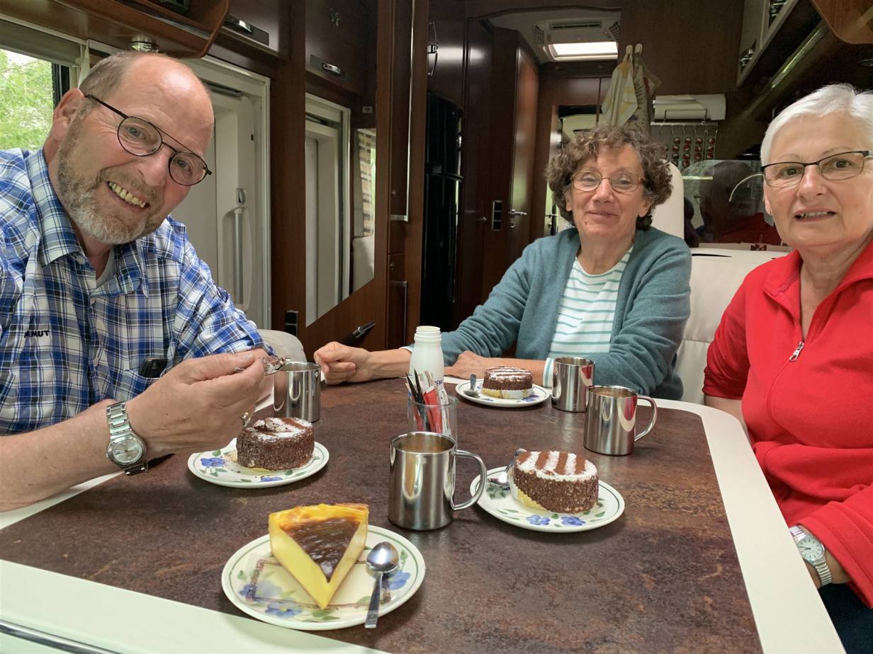 Nelly und Rolf warteten auf uns. Es gab ein fröhliches Wiedersehen. Gemeinsam spazierten wir in die Stadt um Mittag zu Essen. Nelly hatte ein gutes Gespür und für uns ein gutes Lokal gefunden. In der Zwischenzeit hat zu Regnen begonnen. Leider haben Tuulia und ich keinen Schirm mitgenommen. Selber Schuld, den Regen war angesagt. Wir suchten noch kurz eine Bäckerei auf um den Z'vieri zu posten. Dieser wurde im Wohnmobil genossen zusammen mit einem Kaffee.