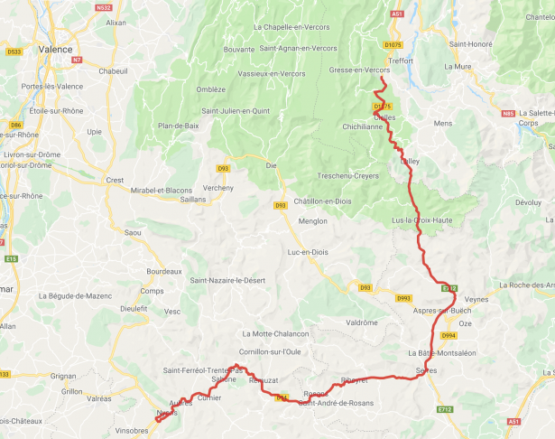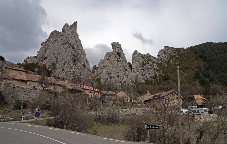 Gegen zehn Uhr wollten wir den Platz verlassen, was wie erwartet nicht möglich war. Die Barriere lies sich mit der Karte nicht öffnen, was wiederum ein Telefonat benötigte. Dann ging es zügig. Wir wollten noch die Stadt besuchen. Der Platz lag rund 3 km vom Zentrum entfernt. Mit dem Wohnmobil gab es aber keine Möglichkeit zu Parkieren. Es war schon alles mit PW verstellt. Also zogen wir direkt weiter Richtung Süden. Alles auf Nebenstrecken via Chambery, dann kurz auf die Mautfreie Autobahn durch Grenoble entschieden wir uns von der Hauptstrecke bei Serres abzubiegen auf der D994 nach Nyons zu fahren. Auch hier wieder ging es über Berg und Tal. Was nicht fehlen durfte waren die tausende von Kreiseln, die grösstenteils wunderschön gestaltet waren. Man hat schön Zeit diese zu betrachten, da man ja langsam unterwegs ist. Was nun kam war eine Augenweide. Wir fuhren durch unberührte Landschaften mit Gesteinsformationen die eine Augenweide waren. Einmal waren wir auf 400 m, dann wieder auf 800 m.