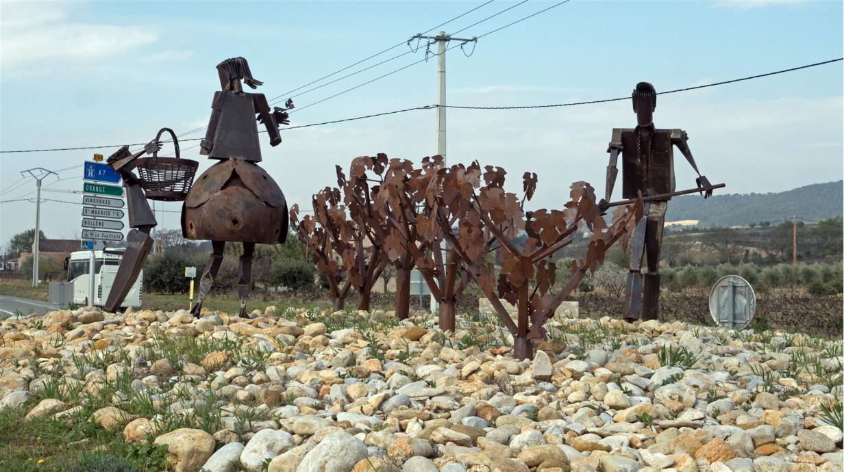Nach rund zwei Stunden machten wir uns auf den Weg ans Mittelmeer. Die ersten 40 km aus Nyons heraus war geprägt durch eine nie endende Ebene mit Weinbergen und Olivenhainen, einen großen Teil der Fläche wird als AOC klassifiziert zusammensetzt. Am Rande des Eygues sind Obstplantagen ebenfalls anwesend: Aprikose, Pflaume, Kirsche ... Der Olivenbaum ist ein integraler Bestandteil des kulturellen Erbes Nyons. Schleie ist die einzige Sorte von Oliven, die auf dem Boden und Klima der Region Nyon angepasst hat. Die Oliven werden reif gepflückt so schwarz, zwischen Dezember und Januar. Oliven und Olivenöl wurden im Jahr 1994 die AOC erhalten. Wir fuhren an bekannten Wein Schlössern vorbei. Im Rhône-Tal werden zu über 90 % Rotweinreben von außerordentlicher Qualität angebaut, die bedeutendste Rebsorte ist Syrah. Im Gegensatz zu den meist schweren Weinen aus dem Norden, werden im Süden auch leichtere Rotweine hergestellt. Die Appellationen des zweitgrößten AOC-Anbaugebiet Frankreichs sind zahlreich, darunter gehören unter anderem Côte Rôtie und Hermitage im Norden sowie Châteauneuf-du-Pape und Côtes du Lubéron im Süden. Dazu gehören auch die Kreisel, die zu hunderten am Weg lagen und teilweise sehr schön gestaltet sind. Als Beispiel sei der untenstehende Kreisel gezeigt, der kurz nach Nyons auf dem Weg lag.