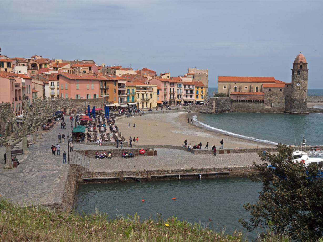 Um einen Überblick zu bekommen fuhren wir ins Dorf runter. Ich dachte vielleicht hat es irgendwo einen Parkplatz. Aber wie erwartet gab es keine Möglichkeit anzuhalten. Also zurück 2 km zum Stellplatz. Ich fragte einen Franzosen wie man in die Stadt kommt. Gleich hier runter meinte er. Gesagt getan. Es war zuerst ein kleiner Feldweg mitten durch die Weinberge und Blumen. Weiter unten kamen dann die ersten Häuser mit Ferienwohnungen. Man konnte über eine kaum befahrene Strasse bis fast Mitten in die Stadt laufen. Nur der letzte kleine Teil mussten wir der gut befahrenen Strasse entlang gehen. Zuerst suchten wir uns ein Restaurant wo es guten Fisch zu Essen gab. Collioure ist neben Argelès-sur-Mer und dem angrenzenden Banyuls-sur-Mer und Port-Vendres ein touristischer Anziehungspunkt an der Côte Vermeille nördlich der Pyrenäen. Es gehört zum Anbaugebiet des Süßweins Banyuls (VDN). Collioure ist ein altes Fischerdorf mit zwei durch eine alte Königsburg getrennte Hafenbuchten, begrenzt durch seine weit ins Meer vorgeschobene malerische Wehrkirche, deren Turm früher ein Leuchtturm war.