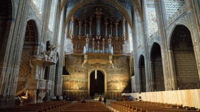 Im Gegensatz zum festungsartigen Äußeren der Kathedrale ist das Innere künstlerisch reich ausgestaltet. Italienische Künstler gestalteten die Fresken im Innenraum im Stil der Frührenaissance. Das Fresko im Gewölbe ist mit einer Länge von 97 m und einer Breite von 28 m das größte Werk der italienischen Renaissance in Frankreich. Es wurde von 1509 bis 1512 durch Künstler aus Modena und Bologna gestaltet. Ein Gemälde an der Westwand des Kirchenschiffes stellt das Jüngste Gericht dar. Von einem unbekannten franko-flämischen Maler zwischen 1474 und 1484 gemalt, ist es eines der bedeutendsten Kunstwerke des späten Mittelalters. Die Orgel wurde zwischen 1734 und 1736 von Christophe Moucherel mit 43 Registern auf vier Manualen erbaut und verfügt heute über 55 Register auf 5 Manualen und Pedal. Besonders bekannt ist ihr Prospekt, mit 9 Rundtürmen der größte historische Prospekt weltweit. Gleichwohl gilt das Instrument als eine der größten und bedeutendsten französischen Barockorgeln. Der ursprüngliche Klangcharakter wurde 1977 -81 wieder hergestellt.