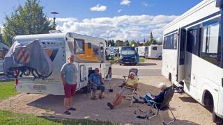 Wir konnten gegen 13.30 Uhr in Embrach starten. Es ging flott bis nach Schaffhausen. Kurz vor der Einfahrt zum zweiten Tunnel hatte ich plötzlich ein Polizei Kastenwagen vor mir, der in unkenntlicher Schrift blinkte und vor mir herfuhr. Nach dem Tunnel lotste er mich per Handzeichen von der Hauptstrasse. Ich folgte rund 2 km wieder zurück Richtung Zentrum. Kurz davor ging es rechts ab zum ehemaligen Güterschuppen, wo die Polizei ein Kontrollzentrum mit Waage vor allem für den Schwerverkehr eingerichtet hatte. Also zuerst auf die Waage, was mir keine Sorge bereitete, hatte ich doch am Morgen mein Mobil in Wallisellen gewogen. Also alles im grünen Bereich. Der Beamte der nachfolgend bei der Bodengrube war eröffnete mir, dass sie heute Reisemobilkontrolle machen. Ich verlor rund eine halbe Stunde, hatte aber keine Beanstandungen. Hinter mir wurde ein Wohnmobil nach dem anderen auf den Platz geführt. Da werden sich wahrscheinlich noch einige geärgert haben, die mit 3.5 t meistens etwas überladen sind. Wir setzten unsere Fahrt fort und waren dann gegen 17.00 Uhr ebenfalls in Krauchen wies. Rolf und Nelly hatten die beiden vor reservierten Plätze in Beschlag genommen. Wir konnten gegeneinander aufstellen.
