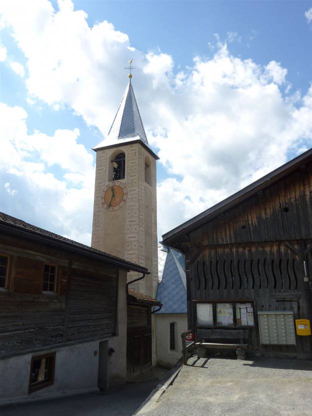 Nach dem Besuch der alten Kirche schaute Tuulia noch die Kirche mitten im Dorf an. Der hohe Kirchturm mit eingeschössiger Glockenstube trägt ein Zeltdach mit Spitzhelm, während das Kirchenschiff mit einem Walmdach bedeckt ist. Im Innern dominiert die linksseitig angebrachte, polygonale und schalldeckellose Kanzel, die dem durch einen Sattelbogen vom Kirchenraum getrennten Chor voransteht. Zentral im Chor steht ein Tauftisch, auf dem nach reformiertem Bündner Brauch auch das Abendmahl gefeiert wird. Die Kirche steht unter dem kantonalen Denkmalschutz. Bei herrlich warmen Herbstwetter mussten wir nun wieder aufwärts nach Lenzerheide laufen. Wir wollten den Bus nehmen, der fuhr aber erst in einer halben Stunde. So entschlossen wir nach einem Einkauf von heimischem Käse den Weg unter die Füsse zu nehmen. Abgekämpft erreichten wir am späten Nachmittag wieder unser Heim. Nach einer kurzen Ruhepause und dem nachgeholten Mittagessen spazierten wir nochmals zum Sportzentrum für den Kaffee und .......