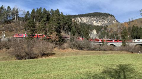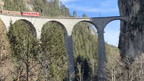 Wir starteten beim Bad. Zuerst geht es etwas hoch bis zum Bahnhof, der ausserhalb des Städtchens liegt. Dann geht es einen Hang entlang immer in Sichtweite der Rätischen Bahn. Immer wieder kamen Bäche mit glasklaren Wasser vom Berg herab. Zum Teil wurden Holzstege in den Hang gebaut damit man einfach dem Hang entlang laufen kann. Unterwegs gibt es einen Bauernhof der einheimische Produkte verkauft. Tausende Forellen sind im glasklaren Wasser bereit für den Teller. Der nächste Halt war dann im Schmittertobel wo ein Kleinktraftwerk Strom für die kleine Gemeinde liefert. Kurz darnach dann das berühmte Landwasserviaduk. Es hat heute die Auszeichnung als UNESCO Welterbe. Eine wunderschöne Steinbrücke, die das Tal überspannt.