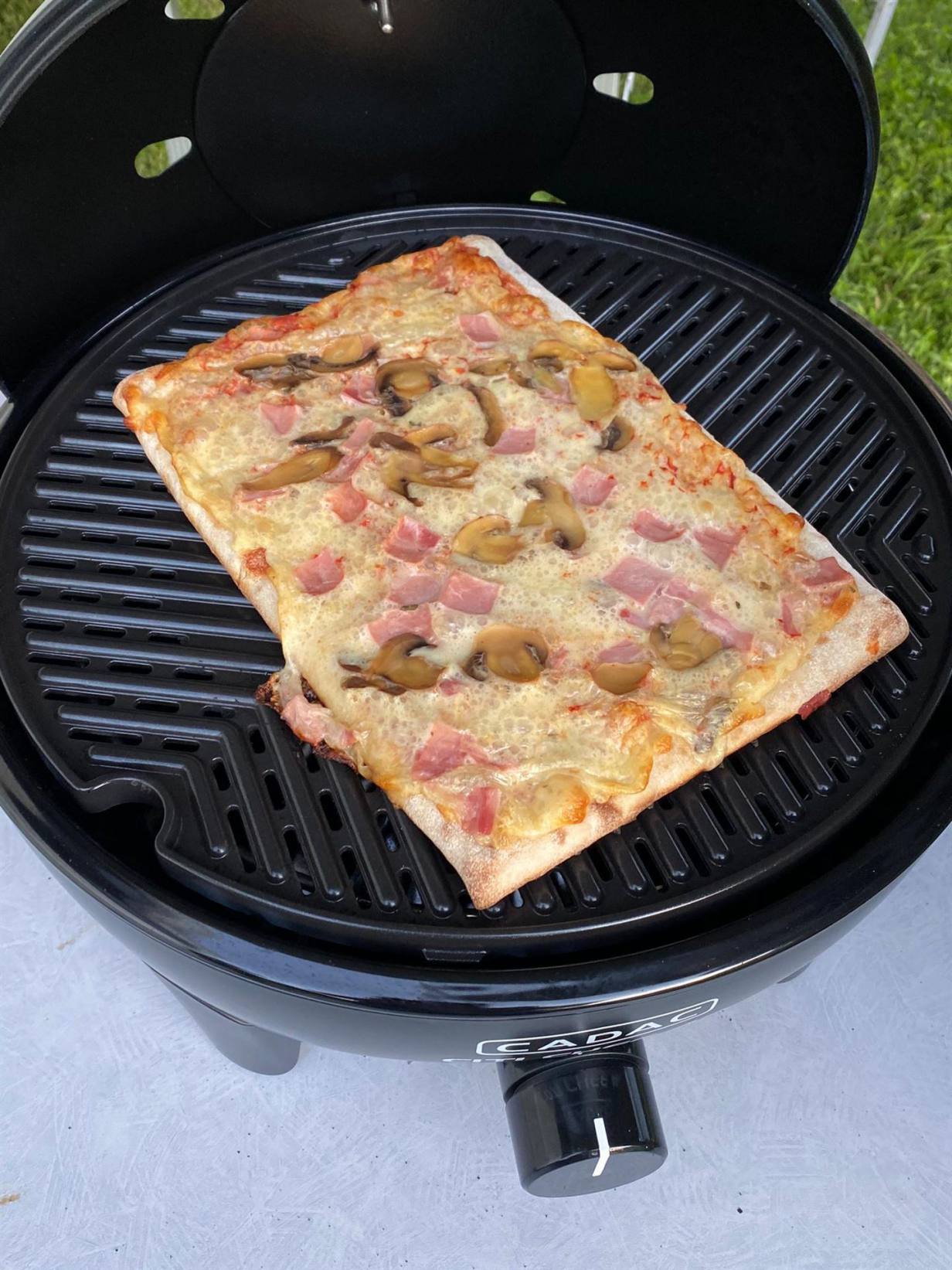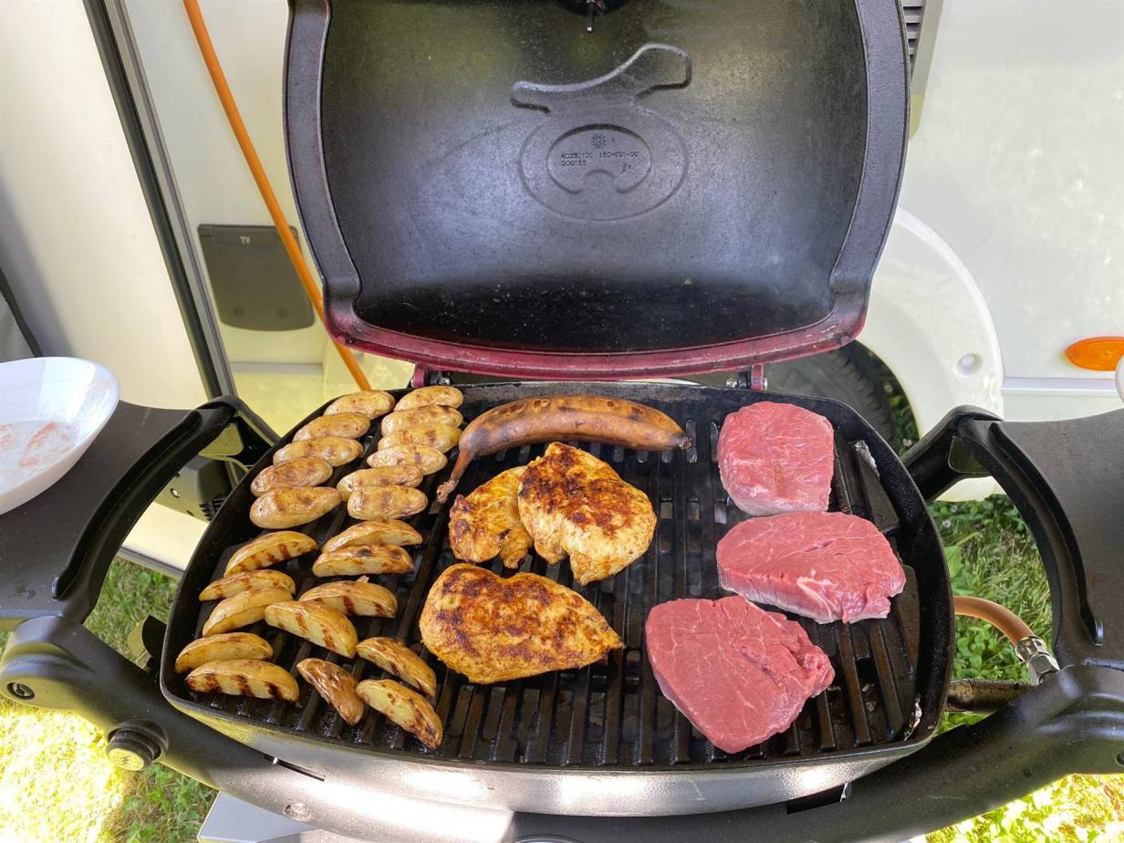 Am Campingplatz angekommen weihten wir meinen neuen Grill ein. Es war spannend für mich die ersten Grilladen auf den Grill zu braten. Gemeinsam assen wir im Schatten meines Wohnmobils zu Mittag. Der anschliessende Kaffee und Gepäck beendeten die Mittagspause. Am Abend gab es noch eine weitere Premiere. Ich habe eine Fertigpizza auf dem Grill gebruzzelt. Überraschenderweise gelang es zu 90 % gut. Kleine verbrannte Stellen am Boden störten nicht.