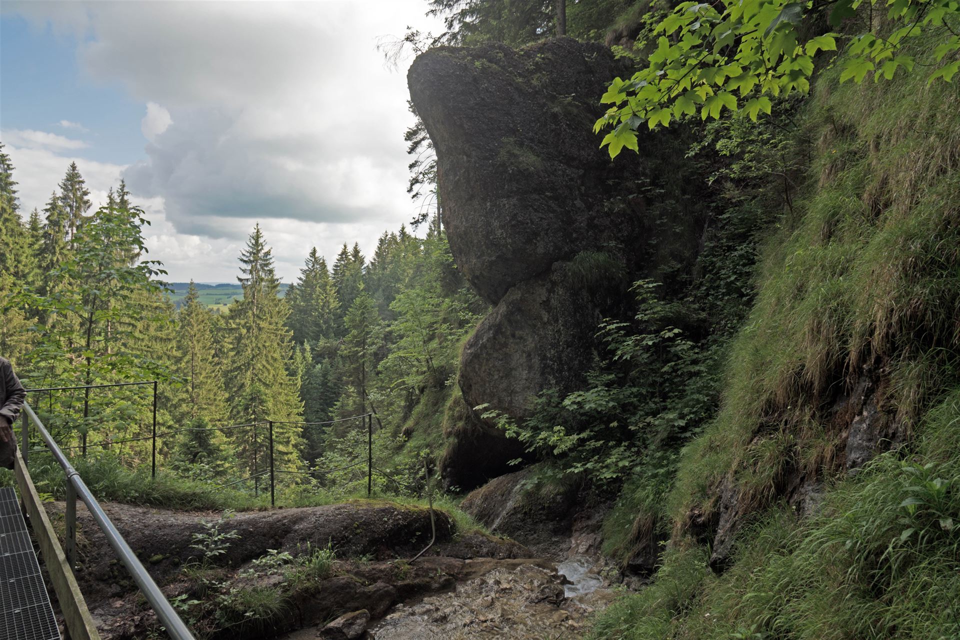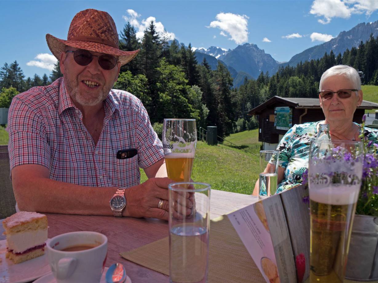 Aber was war da rechts davon ? Eine Himmelleiter ? Jedenfalls weckte das die Neugier von uns. Wir stiegen den Anfang hoch und es wurde immer interessanter. So ging es immer weiter und immer höher. Mit Zwischenhalten und weiteren Naturwegen wollte Tuulia aufgeben. Der mühsame Abstieg erleichterte aber die Entscheidung. Da müssen wir durch. Nach rund 30 Minuten erreichten wir die Kronenhütte auf 1100 m Seehöhe. Glücklicherweise war das Restaurant offen. Wir waren die einzigen Gäste. Wunderschön an der Sonne genossen wir eine kleine Erfrischung an der wärmenden Sonne. Nach einer längeren Erholungspause gab es glücklicherweise einen besseren Weg wieder zurück zum Wohnmobil. Ich hatte gesehen, als wir ankamen, dass es eine kleine Autostrasse gab.