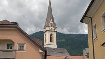 In der Nacht hat es stark geregnet. Kurz nach den Aufstehen war der Spuck vorbei. Es war warm und feucht und die Wolken hingen an den Bergspitzen. Gegen Mittag spazierten wir wieder in die Stadt. Da es bereits Zeit zum Mittagessen war besuchten wir das Restaurant Rathaus. Eine gute Wahl. Es gab ein Menü mit einer hervorragenden Spargelsuppe zur Vorspeise. Als Hauptgang Perlhuhn mir Risotto und dann wurden Dessertvariationen aufgetischt vom Feinsten. Zufrieden mit vollem Magen machten wir uns auf zu unserem Besuch der Kirche.