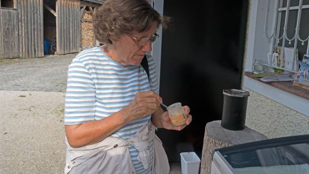 Wir mussten anschliesend zurück, da die Fähre nur bis 17.30 Uhr fährt. Wir spazierten dann den gleichen Weg wieder zurück. Interessant war noch ein Streckenabschnitt kurz nach der Fähre. Es hatte über gut 500 m alles kleine abgesteckte Parzellen teilweise mit Grill und Stühlen, die von den Hotels vermietet oder den Gästen zur Verfügung gestellt werden. Diese haben dann auch direkten Zugang zum See. In der Nähe vom Campingplatz hat es einen Biohof, der in einem Automaten diverse Produkte von Schafen verkauft. Daneben eine Tiefkühltruhe mit Eis. Ich habe das erste mal Eis von Schaffmilch gegessen. Es schmeckt auch gut.