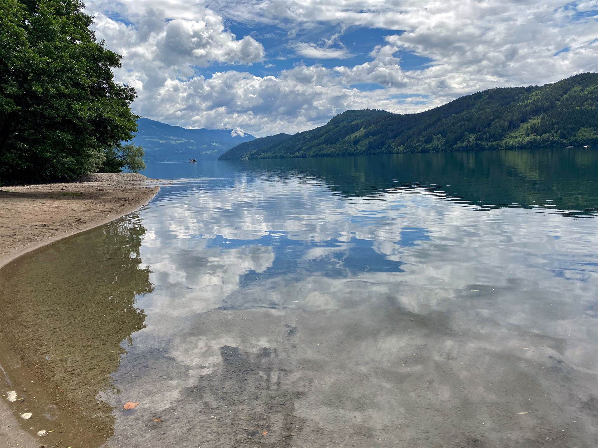 Heute war Ausflugstag. Bei bedecktem Himmel aber warmen Temperaturen machten wir getrennt einen Ausflug. Nelly und Rolf umrundeten mit dem Fahrrad den See, während wir zu Fuss die Südseite erwanderten. Direkt vom Campingplatz aus kann man in den Rundweg einsteigen. Der Weg führt mehrheitlich durch wunderschönen Mischwald. Der Biosphärenpark Nockberge umfasst den größten Fichten-, Lärchen- und Zirbenwald der Ostalpen und damit als Schutzgebiet einzigartig in Europa. Das unverwechselbare Erscheinungsbild des sanften Hochgebirges mit den runden "Nock'n" zählt aus geologischer Sicht zu den erdgeschichtlichen Raritäten und ist einzigartig im gesamten Alpenraum. Unter den runden „Nock’n“ verstehen sich rundgeschliffene Berggipfel, deren Erhebungen max. 2.400 Meter in die Höhe ragen und die Nockberge kennzeichnen. 2013 wurden die Kärntner Nockberge von der UNESCO zum „Biosphärenpark - Modellregion für nachhaltige Entwicklung“ ausgezeichnet und sind somit als älteste Mittelgebirgsform Europas Teil der weltweit 598 Biosphärenparks. Wir liefen circa 6 km bis zu einem Restaurant wo wir eine Pause machten und um 14.00 Uhr das Schiff zurück zum Wohnmobil nahmen. Die beiden Radfahrer waren bereits zurück. Ich lasse etwas die Bilder sprechen.