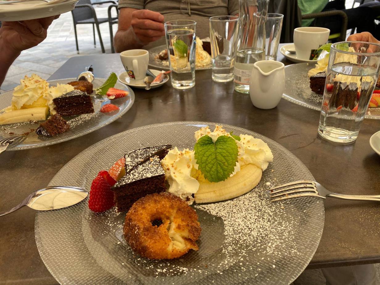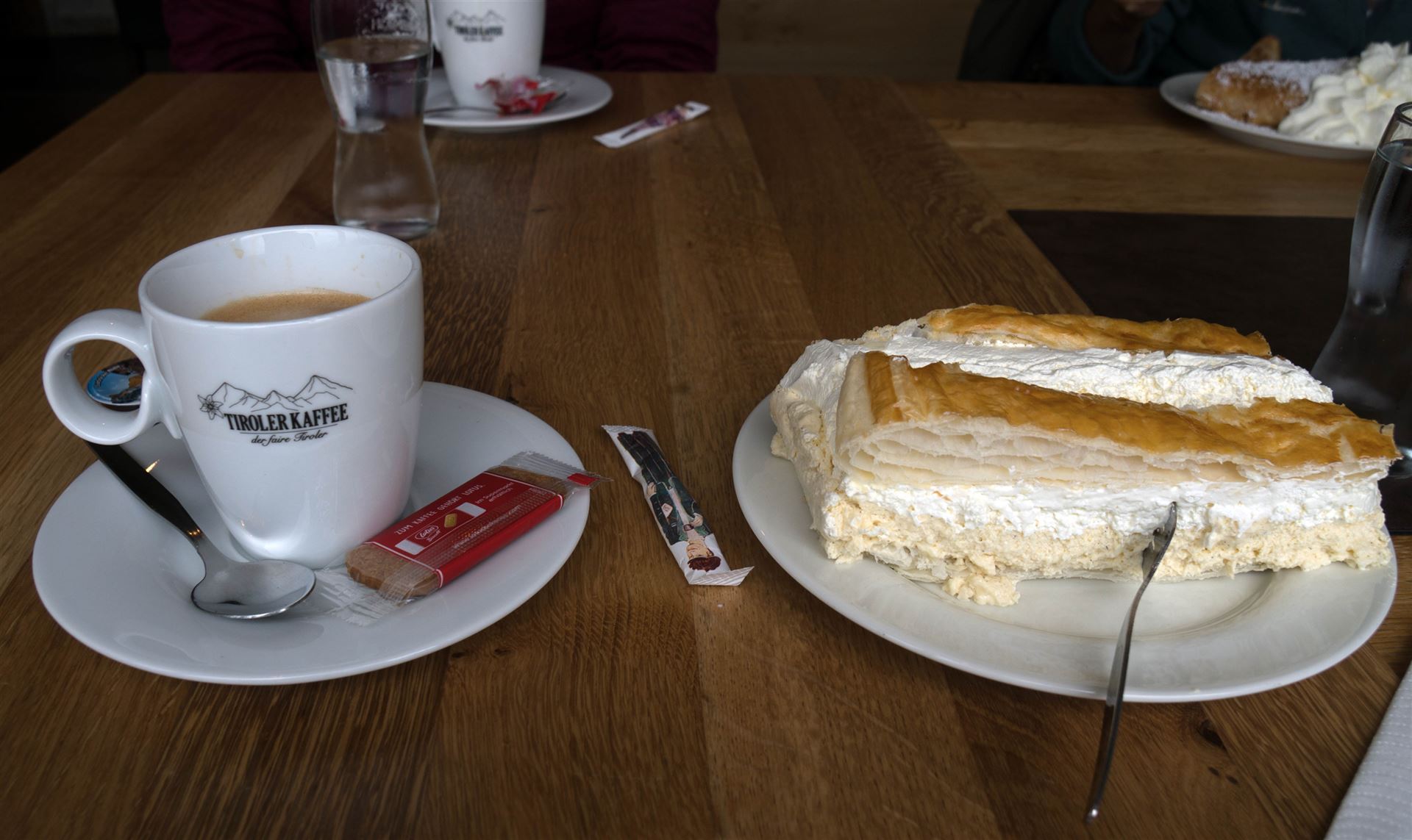 Wir stehen auf dem Campingplatz Seen Camping in Kramsach. Vor dem Campingareal hat es einen schönen Stellplatz mit grossen absolut geraden Plätzen auf Rasengittersteinen. Der Platz liegt wenige Meter neben dem See. Wir sind nach dem wir eingecheckt haben noch um den See gelaufen. Es hat die ganze Zeit geschüttet. Die Natur ist aber herrlich frisch und die Landschaft ein Traum. Zuerst aber kurz nach dem wir den Rheintalersee erreichten fanden wir ein Restaurant und Kaffee. Ich bestellte eine Creme Schnitte und war erstaunt was ich bekommen habe.
