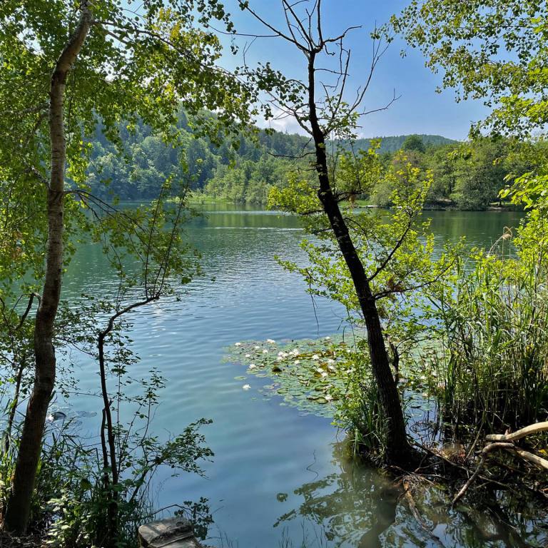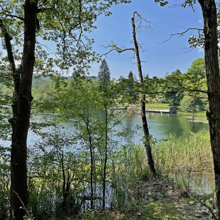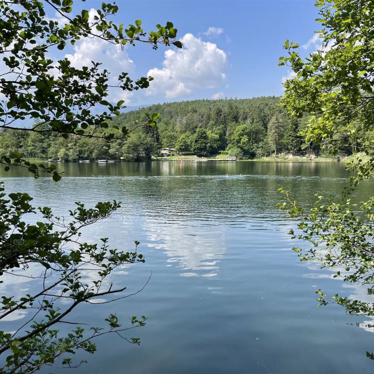 Der Kleine Montiggler See lädt im Sommer zum Baden ein. Viele Einheimische genießen den See und die herrliche Liegewiese. Eingebettet in Wald- und Hügellandschaft bietet der Kleine Montigglersee eine besondere Atmosphäre beim Baden. Nach der Einkehr machten wir uns auf den Weg rund um den See. Er ist rund 400 Meter vom Montiggler See entfernt und liegt ein paar Höhenmeter oberhalb. Wunderbar naturbelassen ist das fast 900 Meter lange Ufer rund um den See. Meist ist es zugewachsen. Viel Wald umgibt die rund 5 Hektar große Wasserfläche. Dort wo man an das Ufer und ans Wasser kommt, befinden sich einige natürliche Badeplätze. Sie sind kostenlos zugänglich. Es ist ein naturbelassener See mit seichten Ufern und vielen Pflanzen.