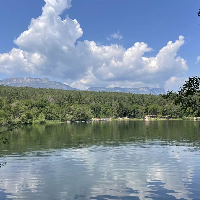 Nach dem kleinen Gewitter gestern war es heute Morgen wieder schönstes Wetter. Nach der gestrigen Fahrerei und Wirrungen gingen wir es heute ruhig an. Ich bin mit "meinen" zwei Frauen noch zum kleinen Montiggler See hoch gelaufen. Im Schatten des Waldes war es angenehm. Oben angekommen benutzten wir die Gelegenheit zu einem Apéro unter den Bäumen. Unten ist ein kleines Strandbad. Da wir früh waren hatte es auch noch nicht viel Leute.