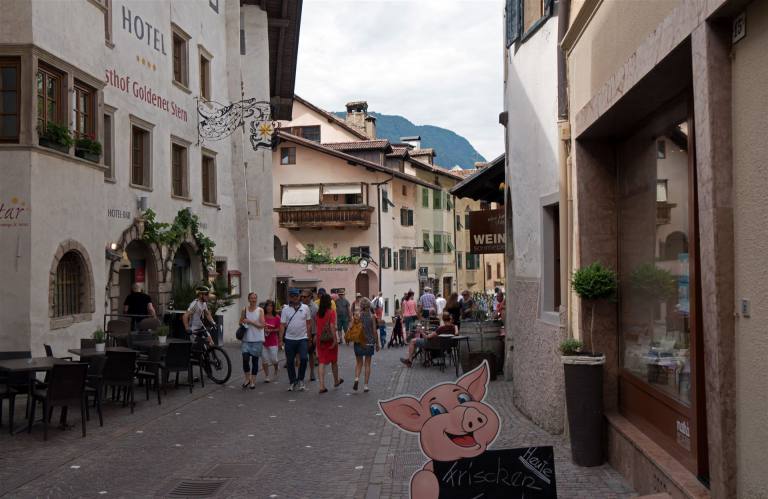 Am Morgen nach dem Frühstück mussten Nelly und Rolf forfait geben. Nelly hatte gesundheitliche Probleme und brauchte einige Stunden Ruhe. Also machten wir uns alleine auf den Weg. Zuerst brachte uns die Campingplatz Besitzerin mit dem PW zur Busstation. Leider ist die Station vor dem Campingplatz erst nächste Woche in Betrieb. (Corona) Wir besuchten zuerst von das Dorf Eppan an der Weinstraße. Es ist eine italienische Großgemeinde mit 14.932 Einwohnern in Südtirol. Eppan ist die sechstgrößte Gemeinde Südtirols und mit einer Kleinstadt vergleichbar. Eppan liegt an der Südtiroler Weinstraße im Überetsch zwischen Bozen und Kaltern. Der Alte Stadtteil hat sehr schöne Häuser und auch eine nette verkehrsfreie Einkaufsstrasse. Wir schlenderten rund eine Stunde umher und begaben uns darnach zur Bushaltestelle Eppan Bahnhof. Aber wo ist der Zug ?? Es gibt schon lange keine Eisenbahn mehr auf dieser Strecke. Der Bahnhof ist aber nach wie vor vorhanden und beinhaltet ein Restaurant und ist auch gleich Busstation.
