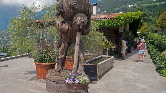 Der Bus der zum Startpunkt des Tappeinerweges fuhr fährt nicht regelmässig. So sind wir nach dem Marktbesuch gegen Mittag zur Bushaltestelle gelaufen, die sich direkt am Bahnhof befindet. Ein schmaler Weg und ein mittelgrosser Bus ist für den Chauffeur schon eine Herausforderung. Der Eingang zum Weg ist sehr schön gestaltet.