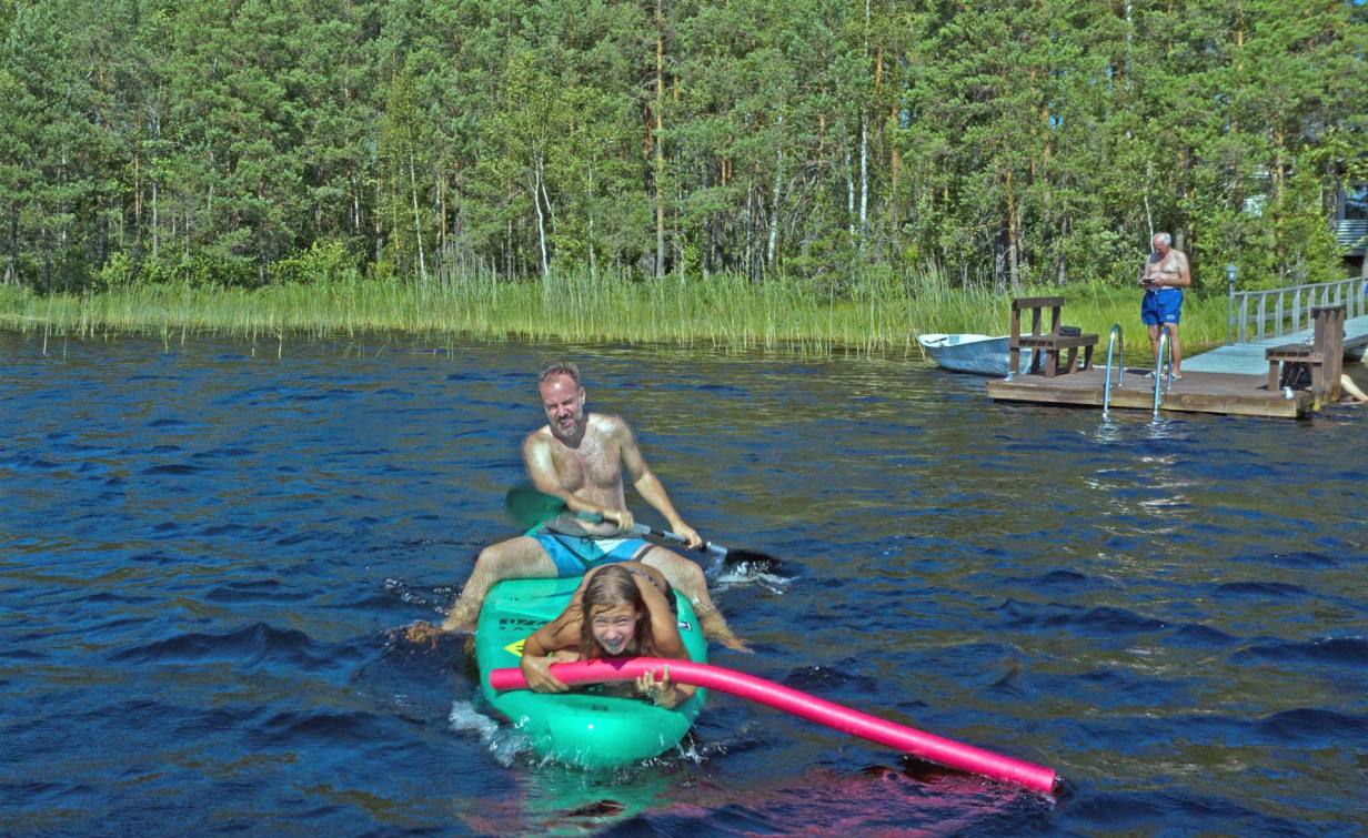 Wir waren schnell vom Schiff und fuhren direkt nach Imatra. Wir sind noch "schnell" einkaufen gefahren. Mit den Dimensionen der Finnischen Einkaufsgeschäfte ist es so eine Sache. Wo findet man was man sucht ? Man muss Kilometer zurücklegen bis man alles hat. Im Fluge gingen zwei Stunden vorbei. Zum Glück waren es nur noch 60 km nach Puumala. Joana und Sabrina, die Lebenspartnerin von Markus erwartete uns schon. Markus war beim Arbeiten. Das Wetter war hervorragend und rund 23°C warm. Der See anscheinend auch warm, den die beiden wagten einen Sprung in das glasklare Wasser.