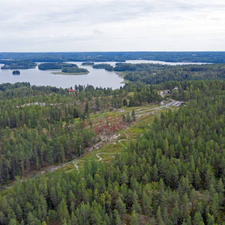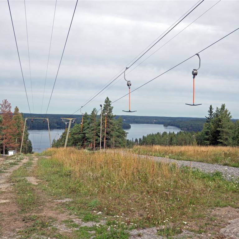 Ich habe zwar im fernsehen auch schon schwierige Strecken gesehen. Die erschwerend kommt dazu dass neben Wurzeln auch massive Steine im Wege sind. Ich hatte schon zu Fuss Mühe die Passagen zu durchschreiten. Oben angekommen hat man eine schöne Aussicht auf die Seen, die rundherum zu sehen sind. Es ist auch das Ende des Skiliftes. Das Skigebiet Ellivuori befindet sich in Pirkanmaa. Zum Skifahren und Snowboarden stehen 2,7 km Pisten zur Verfügung. 5 Lifte befördern die Gäste. Das Wintersportgebiet liegt auf einer Höhe von 60 bis 145 m. Das Skigebiet Ellivuori biete passende Pisten für die ganze Familie. Auf den beleuchteten Pisten kann auch im dunkeln noch perfekt abgefahren werden. Die Pisten sind nicht mit unseren vergleichbar. Anscheinend ist im Winter doch allerhand los hier. Das Resort das am Ende des Berges steht ist riesig. Es gibt auch viele "Hütten" zum mieten. Es sind teilweise luxuriöse Wohnungen. Man kann auch Containerartige Häuser bauen mit Seesicht.