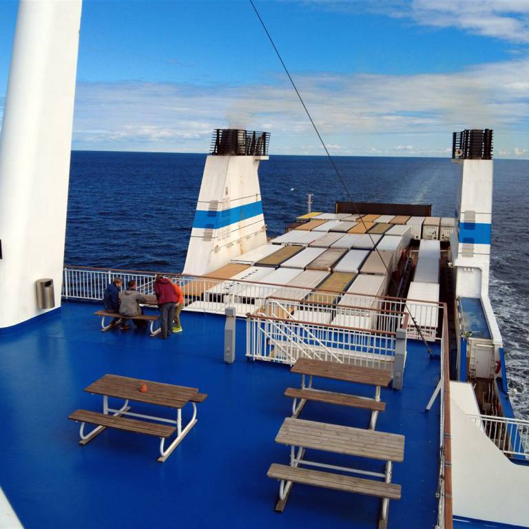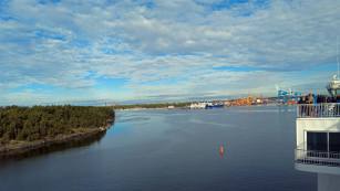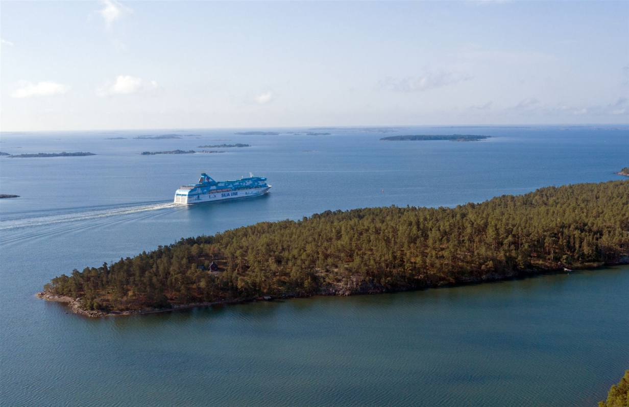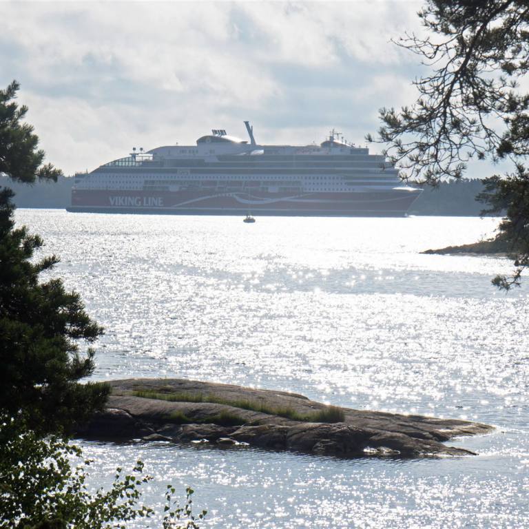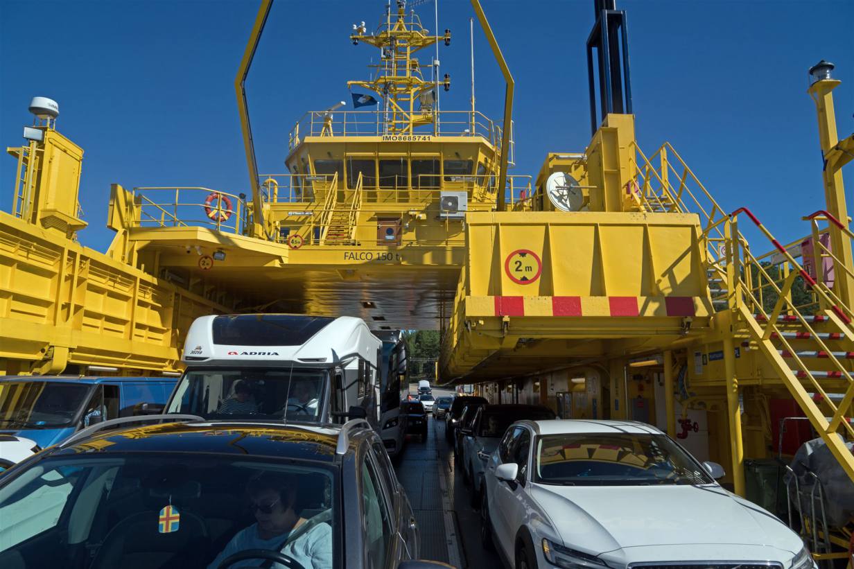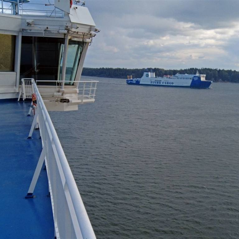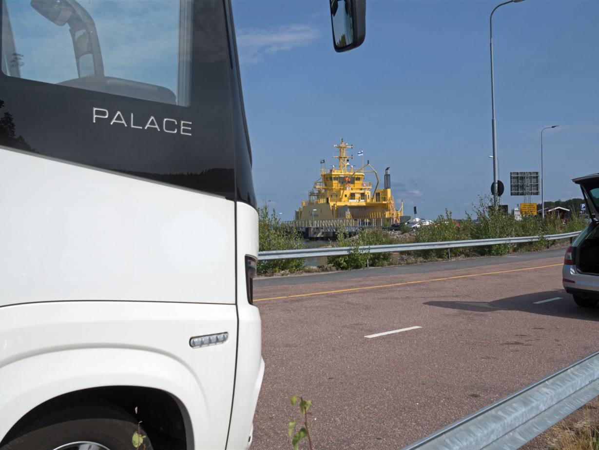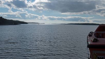 Als ich wieder in Nago war fuhr ich die Ringstrasse weiter. Nach kurzer Zeit kam die nächste Fähre, die 700 m Wasser überbrückte. Nach weiteren Kilometern kam bereits Fähre Nr. 3. Diesmal musste ich zuerst fast eine Stunde warten und dann wurden die 23 km Wasserweg in etwas weniger als einer Stunde erledigt. Es war eine recht grossse aber immer noch eine Gratisfähre. Am Ende der Fahrt kreuzten wir die Fähren Sila Line und Vikingline die nach Turku einfuhren. Beider Ankunft sah ich schon von weitem einen Campingplatz der direkt neben der Anlagestelle ist.