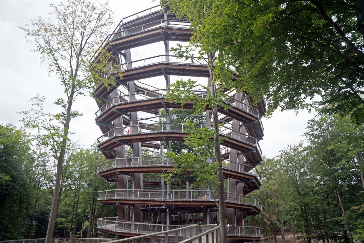 Nach dem Besuch der Kirche fuhren wir rund 8 km weit zum Baumwipfelpfad Steigerwald. Der fast ebene Rundweg, dessen Aussichtsturm sich als Spirale aufwärts schlängelt, ermöglicht ansonsten nicht erreichbare Ebenen des Ökosystems Wald zu erleben und einen beeindruckenden Rundumblick zu genießen. Man läuft auf einem Holzsteg auf halber Baumhöhe zum Turm. Unterwegs sind jeweils Erklärungen zum Wald und zur Bewirtschaftung. Der Weg schlängelt sich langsam nach oben bis über die Baumwipfel wo man einen herrlichen Ausblick auf den Steigerwald und die Umgebung hat.