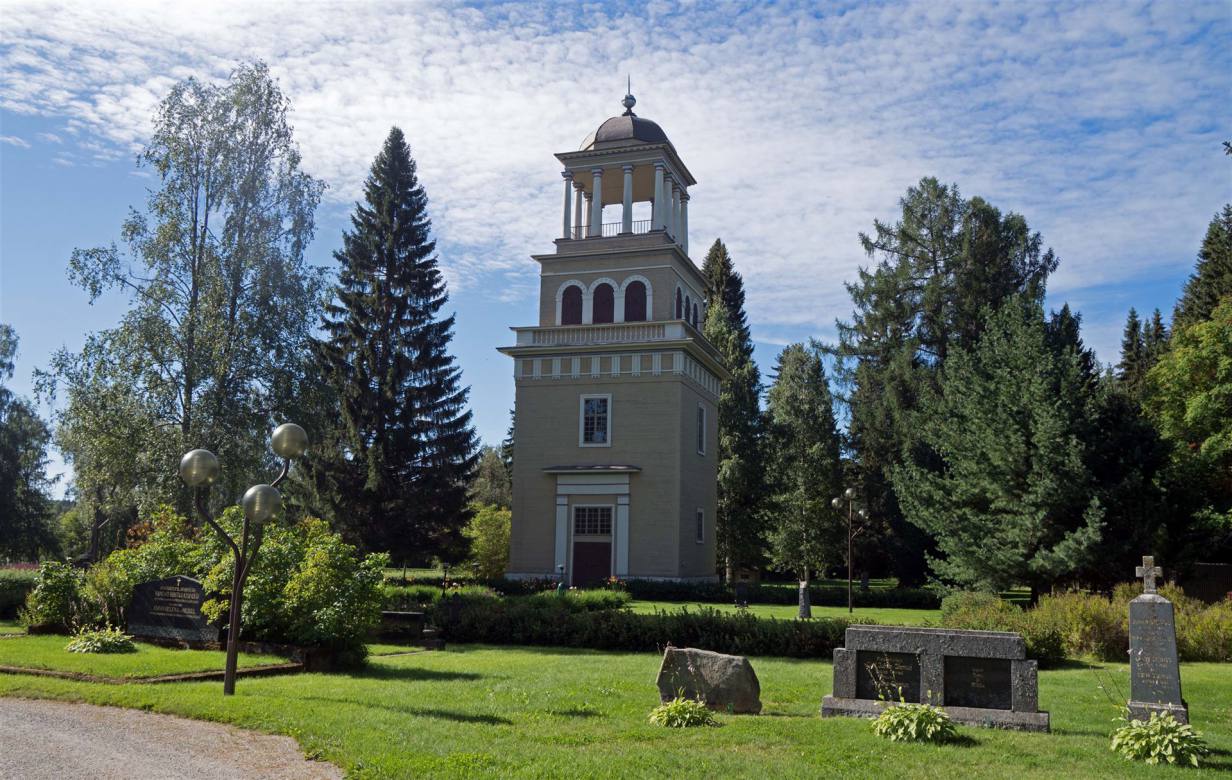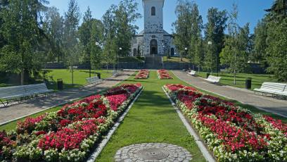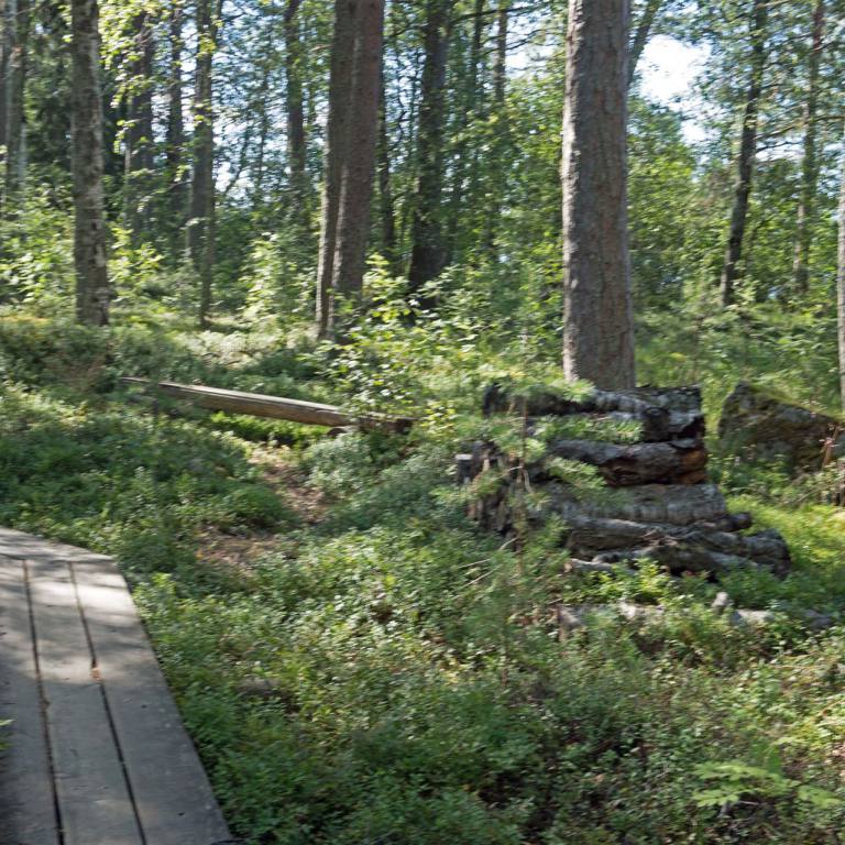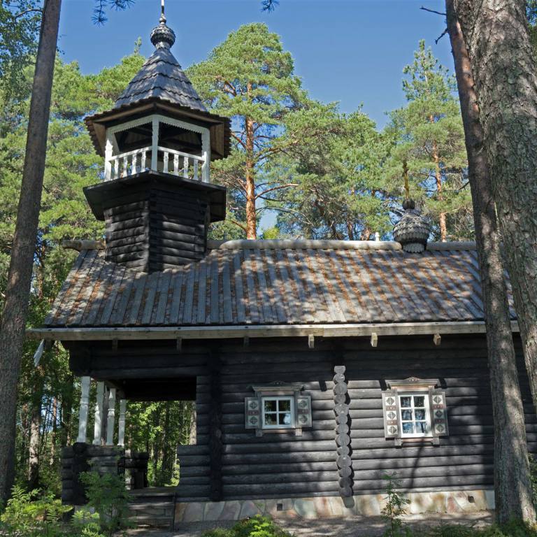 Das Juwel des karelischen Dorfes und auch die Hauptattraktion ist das Bomba-Haus, dessen Architektur die wechselhafte Geschichte des Ortes, an dem Ost und West zusammentreffen, erzählt. Das Haus, das im August 1978 seine Eröffnung feierte, ist nämlich eine Kopie des Hauses, das Jegor Bombin im Jahr 1855 baute und das sich im karelischen Suojärvi auf der russischen Seite befindet. Das ursprüngliche Bomba-Haus wurde einigen Veränderungen unterzogen, sodass es sich besser für den Tourismusbetrieb eignet. Zum Beispiel werden dort, wo ursprünglich der Stall stand, heutzutage Gäste mit Speis und Trank im Restaurant bewirtet. Um das Bomba-Haus herum wurde das allseits beliebte karelische Dorf errichtet, um das Tourismusprogramm weiter zu ergänzen. Nach dem Besuch des Hauses spazierten wir noch durch den Wald zu einer kleinen orthodoxen Kapelle am See. Leider war sie geschlossen.