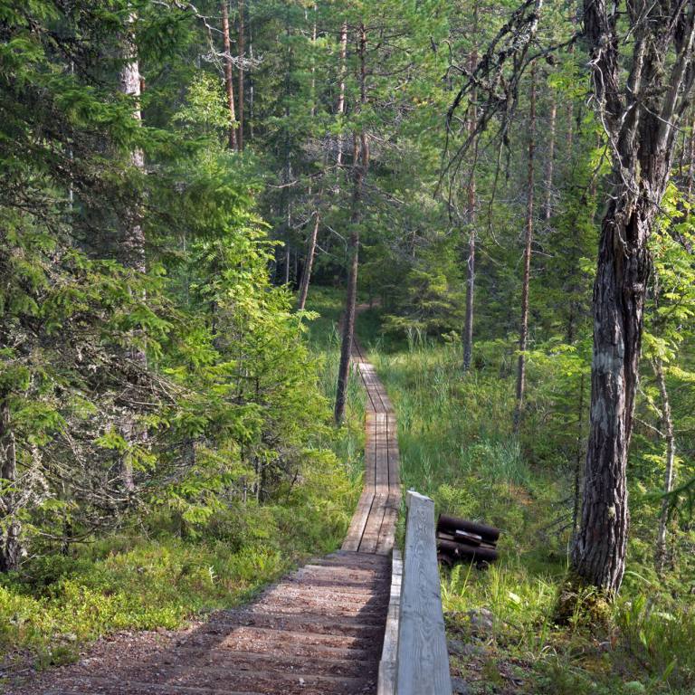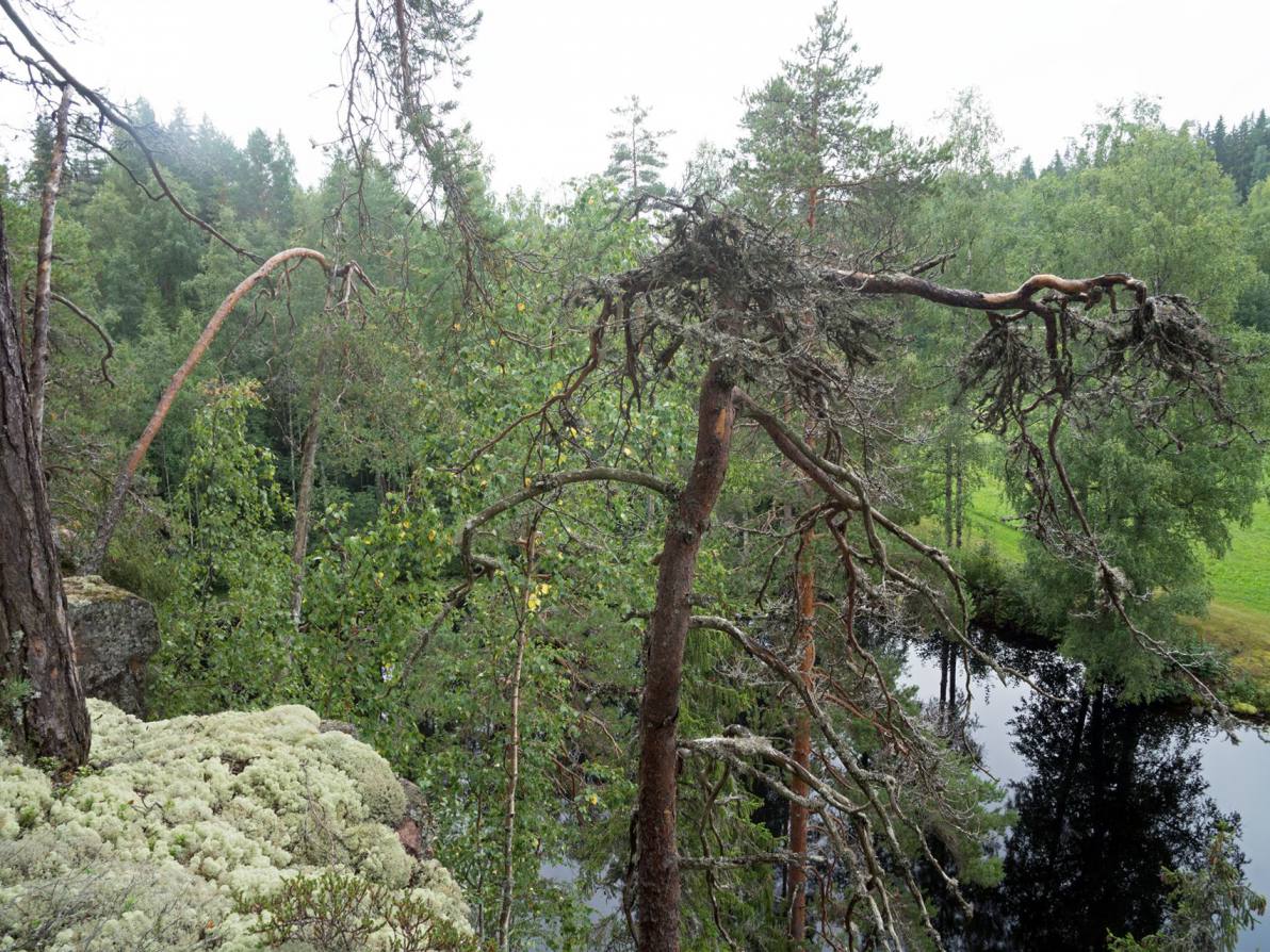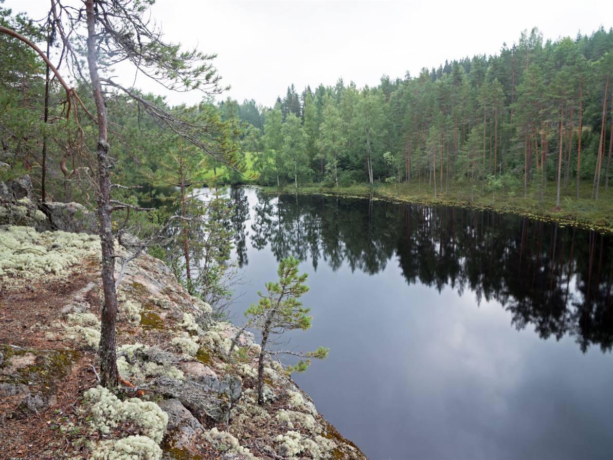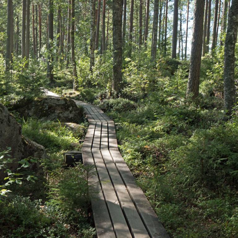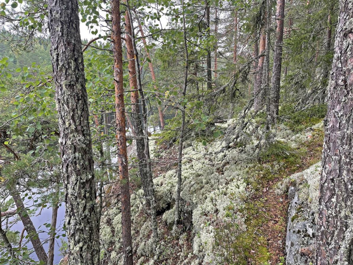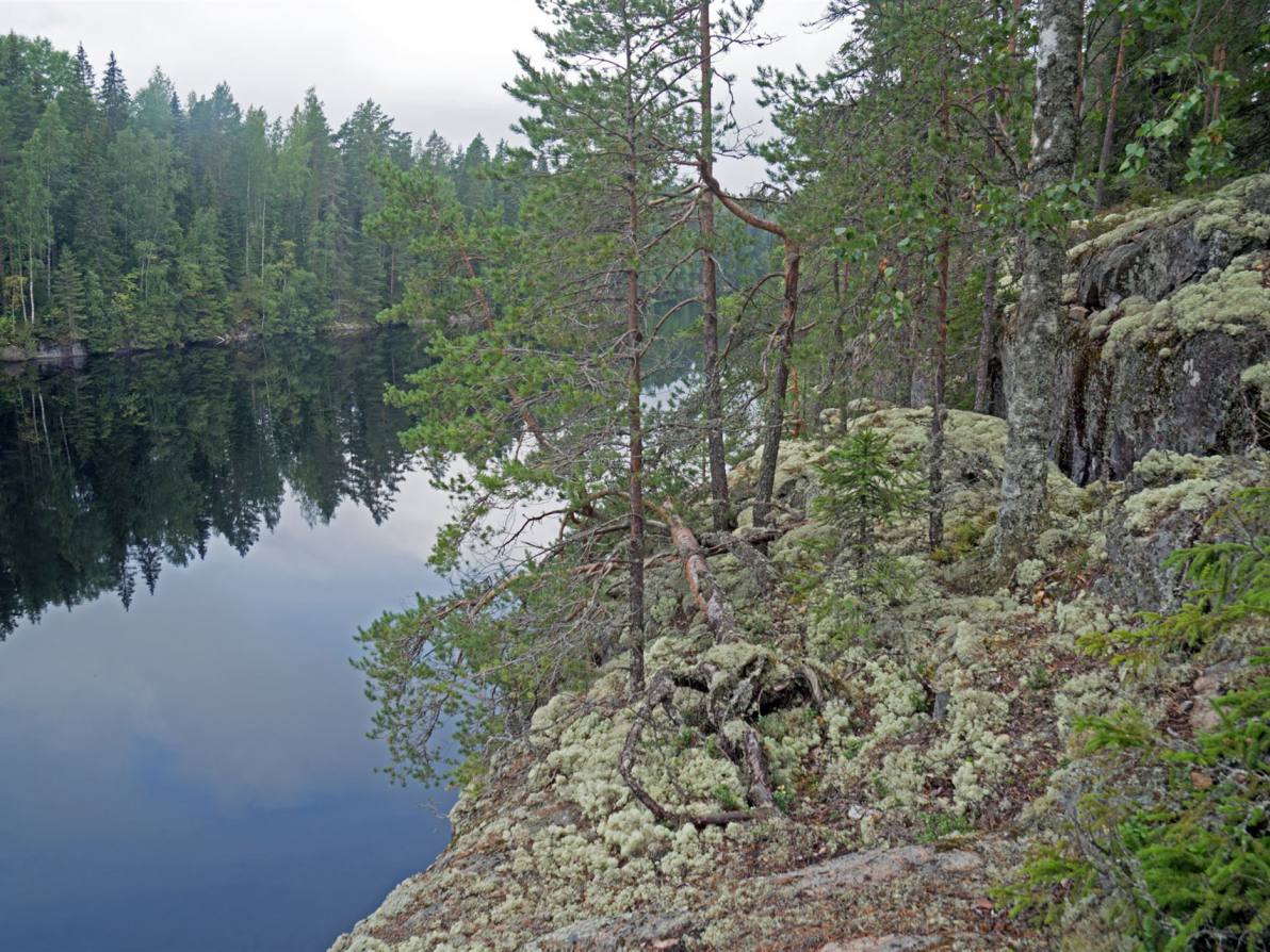 Nun hatten wir nicht mehr weit zu unserem heutigen Ziel. Der Nationalpark Süd-Konnevesi ist ein Muss für Naturfreunde: die wellige Landschaft inmitten der klaren Gewässer ist die Heimat wilder Fischadler – unter ihren scharfen Augen wandert man im Schatten hundertjähriger Pappeln oder besegelst den bildschönen See Konnevesi, Lebensraum der seltenen Forelle des Rautalampi Wasserweges. Wir parkten an einem der Eingänge Kalaja genannt. (N62°35'32.8, O26°42'31.6). Von hier aus kann man verschiedene Routen wandern. Aber Vorsicht das ganze ist nicht leicht zum Laufen. Es geht bergauf dann wieder bergab und alles noch übersäht mit Wurzeln und Steinen. Wir versuchten um den See zu laufe, was eine weile lang gut ging. Am Ende des Sees war der Weg für Tuulia dann doch zu schwer. Es ging steil bergauf und war übersäht mit unterschiedlich dicken Wurzeln. Wir drehten dann ab und gingen den Weg zurück. Trotzdem war es eine schöne Wanderung. Der Weg vom See zum Wohnmobil ist 900 m lang und gut zu Laufen. Wir übernachten nun hier mit einem Finnen ebenfalls mit dem Mobil auf dem Parkplatz. Es ist gespenstisch ruhig. Wir werden sicher gut Schlafen.