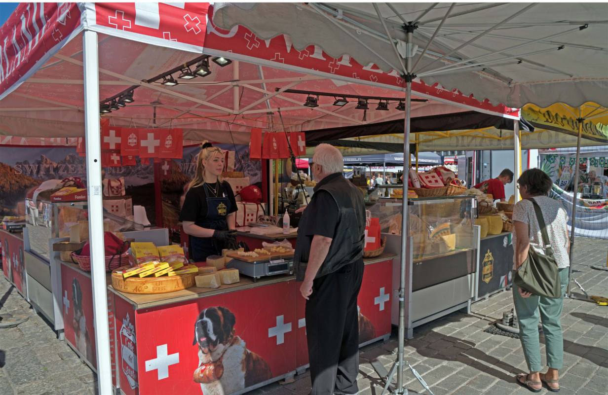 Nach der Rückkehr ging es sofort weiter in die Stadt. Der Bus fährt direkt vor dem Campingplatz los, aber nur jede Stunde. Es passte genau, denn wir waren 11.25 Uhr an der Haltestelle, wo der Bus pünktlich kam. In knapp einer Viertel Stunde brachte er uns direkt ins Zentrum von Kuopio. Auf dem Marktplatz war viel los. Es hatte unendlich viele Marktstände mit internationalen Speisen und Getränken und weitere Verkaufsstände mit allerlei nützlichen und weniger nützlichen Artikeln. Es war ein internationales Fest mit Teilnehmern aus Italien, Australien, Bayern usw. Die Schweiz hatte auch einen Stand mit Käse. Es war interessant die Marktleute sprechen zu hören. Die einen boten mit immer den gleichen finnischen Sprüchen ihre Waren an. Wenn man mit ihnen sprechen wollte funktionierte nur deren Sprache. Aber irgendwie funktionierte das trotzdem. Wir haben an einem Stand dann Mittag gegessen. Fisch mit Kartoffeln und Gemüse schmeckte herrlich.