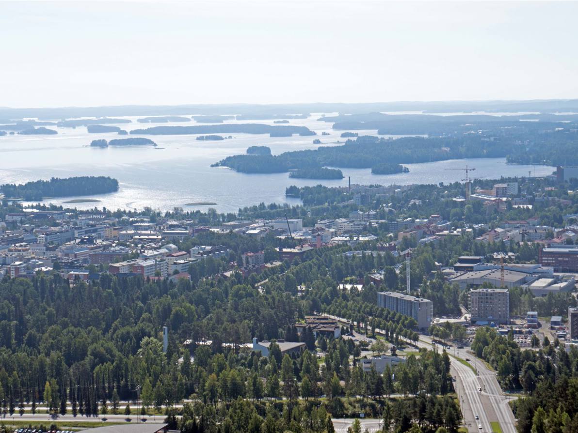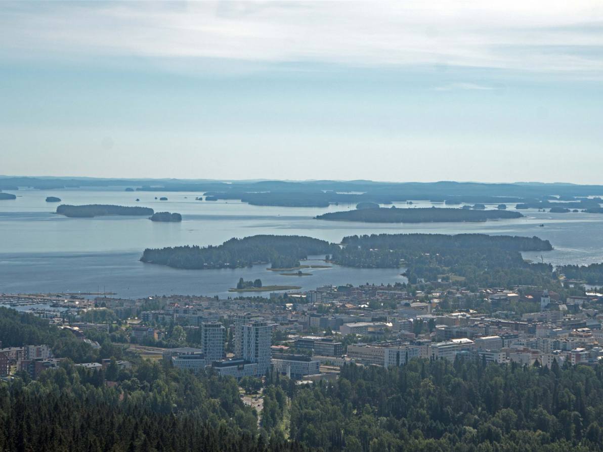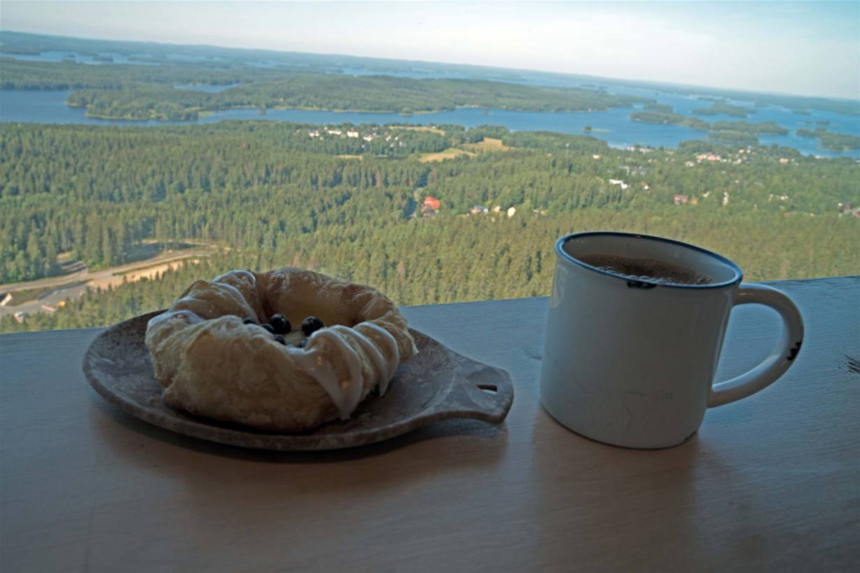 Wir wollten Kuopio nicht verlassen ohne dem Puijo noch zu besuchen. Der Puijo-Turm ist ein 1963 erbauter 75 Meter hoher Fernsehturm oberhalb der Stadt. Unterhalb sieht man die Puijo-Schanze. Im Jahre 2004 wurde er umfassend renoviert und verfügt über zwei Aufzüge und Treppen, um zur Aussichtsplattform zu gelangen. Dieser für die Öffentlichkeit zugängliche Turm verfügt über ein Drehrestaurant mit 100 Plätzen. Der heutige Puijo-Turm hatte zwei Vorgänger. Der erste Turm wurde bereits 1856 aus Holz gebaut und hatte eine Höhe von 16 Metern. Ein zweiter Turm aus Ziegeln mit einer Höhe von 24 Metern wurde 1906 erbaut. Während des Zweiten Weltkrieges diente der Turm der Luftüberwachung. Er wurde 1963 beim Bau des heutigen Turmes entfernt. Wir benutzten de Lift zum Kaffee. Zu Fuss ging es eine Etage höher, wo keine Scheiben die Sicht einschränken. Es ist schon spektakulär wie weit man sieht. Die ganze Seenplatte mit ihren Inseln erscheint am Morgen bei besonderem Licht. Da mussten wir noch einen Halt im Kaffee machen von wo man ebenfalls eine hervorragende Aussicht geniessen kann.