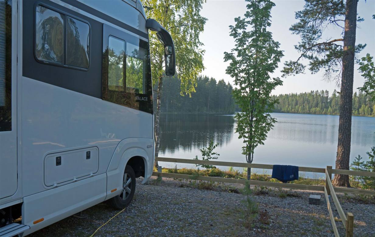 Jetzt kam der entscheidende Moment wo der Plan vom Morgen über den Haufen geschmissen wurde. Stellplatzführer und Karte konsultieren und einen Platz mit Wasser suchen. Den fanden wir schnell und erst noch in der Nähe. Das Ahvenlampi Camping bietet Grillmöglichkeiten, ein Geschäft in der Unterkunft und eine Snackbar. Zu den weiteren Einrichtungen gehören ein Gemeinschaftssitzbereich, ein Spielezimmer und eine Gepäckaufbewahrung. An der Unterkunft und in der Umgebung können Sie zahlreichen Aktivitäten wie Skifahren, Angeln und Wandern nachgehen. Tönt alles gut. Aber der Platzwart musste zuerst organisiert werden. Kein Fahrzeug auf dem Platz. Ist der Platz geschlossen ???? Nach einem Telefonat kam er mit dem Auto checkte uns und drei weitere Fahrzeuge die gewartet hatten ein. Wir stehen direkt am See mit herrlichem Blick. Nun schnell ins Wasser. Der glasklare See war etwas mehr als 20°C warm. Wunderbare Abkühlung bei den heissen Temperaturen.
