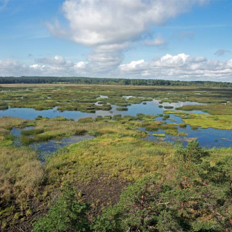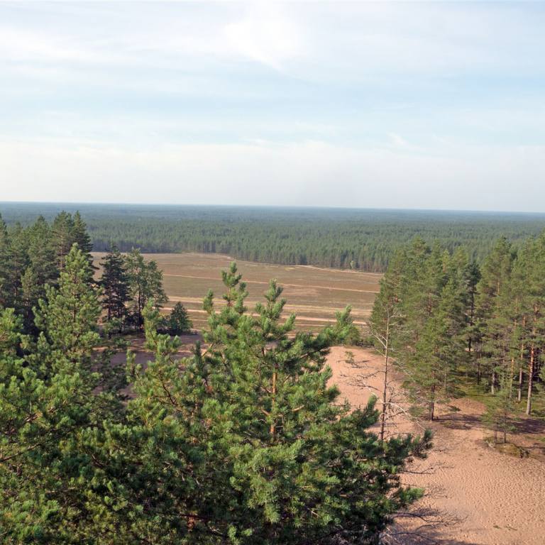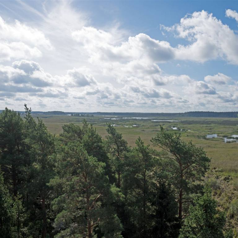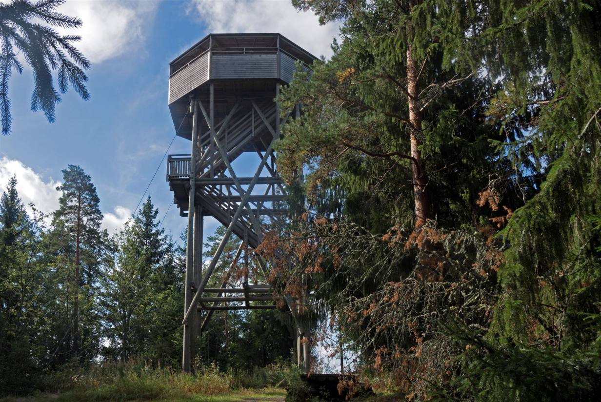 Ich habe in Pori auf dem Areal des Sportzentrums übernachtet. Nachdem es gestern geschüttet hat war es heute morgen widererwarten schön mit blauem Himmel und Schönwetterwolken. Nach meiner Planung von gestern Abend geht es heute zuerst in einen Nationalpark südlich von Pori. Er nennt sich Puurijärvi-Isosuo. Es gibt verschiedene Beobachtungsorte. Ich war beim Karjenkallio. Ein gut beschilderter Parkplatz bietet auch für grosse Fahrzeuge genug Platz. Ein Weg führt durch einen Wald. Nach 400 m kommt man zum ersten Beobachtungspunkt. Der Park wurde 1993 gegründet und ist 27 Km2 gross. Von dort aus sieht man eine grosse Sumpflandschaft aber nur wenige Vögel. Ich lief weitere 400 m zu einem wahrhaft grossen Turm. er hat eine Höhe von 18 m und ist aus riesigen Holzstämmen gezimmert. Eine Leiter führt auf eine grosse Plattform.