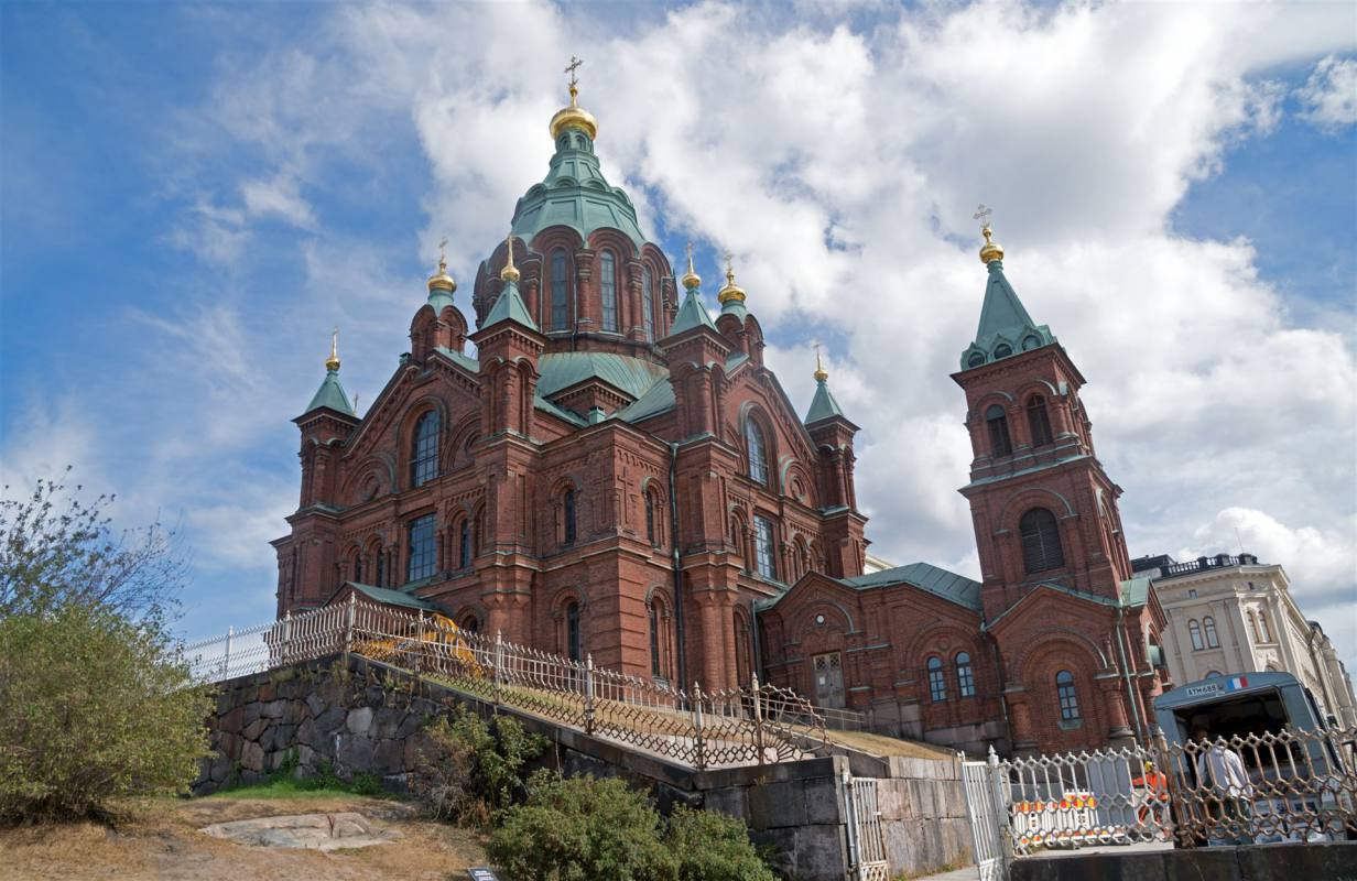 Von weitem sieht man auch die orthodoxe Kirche von Helsinki, die ebenfalls auf einem steinigen Hügel steht. Die Uspenski-Kathedrale ist eine der Attraktionen Helsinkis, deren Besichtigung man unbedingt einplanen sollten. Jedes Jahr zieht es mehr als 500.000 Gläubige und Urlauber zu dieser besonderen orthodoxen Kirche. Aufgrund ihrer zentralen und zugleich erhöhten Lage auf der Halbinsel Katajanokka ist das Bauwerk mit seinen 13 Kuppeln gut zu sehen und zu finden. Zwei Brücken verbinden die Halbinsel mit dem östlichen Festland der Stadt.