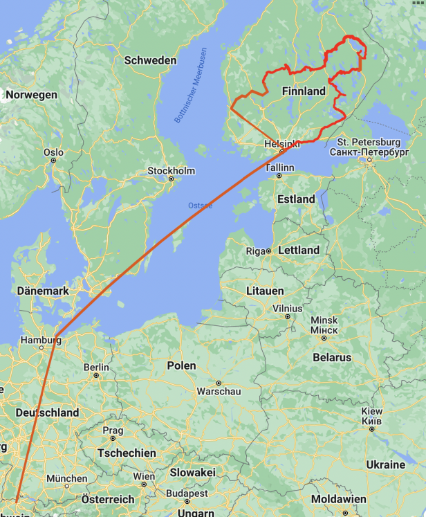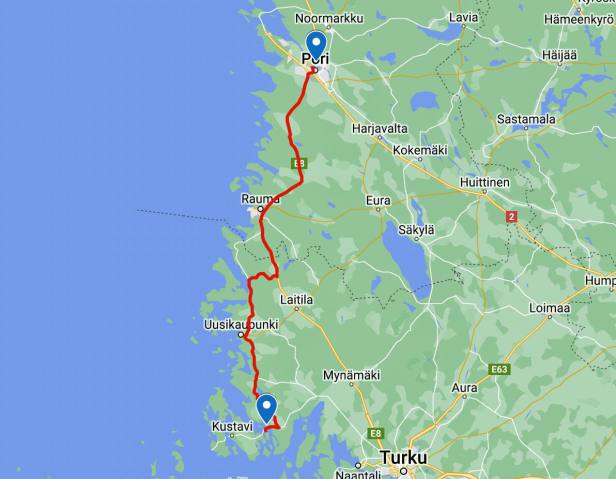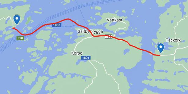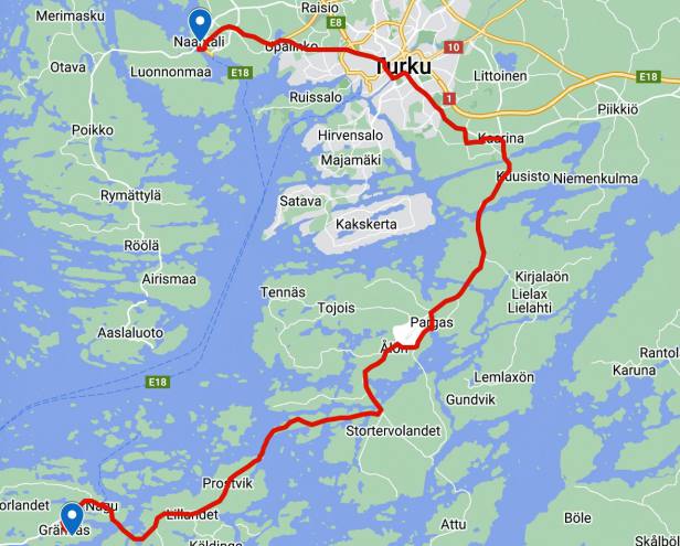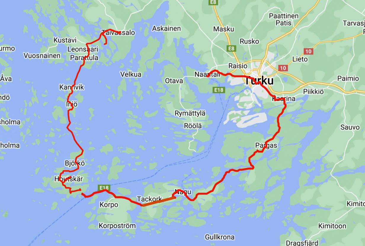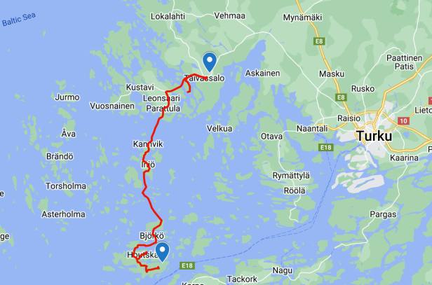 Mit dem Bild möchte ich euch zeigen wie die Route von Insel zu Insel verläuft. Das ist wirklich sehenswert bei schönem Wetter. Ich habe nach der letzten Fähre noch einige Kilometer zum Fahren bis zum Campingplatz. Ich staunte bei der Ankunft. So voll habe ich bei meiner Reise keinen Campingplatz gesehen. Es wurde mir aber noch ein Platz zugewiesen. Es ist aber eng wie auf einem Stellplatz. Ich stehe aber trotzdem wenige Meter vom Meer entfernt. Jetzt hat es mit Regnen begonnen. Ist mir egal. Meine wöchige Reise hatte viele schöne Seiten. Ich fahre Morgen nun nach Pori um Tuulia zu holen. Am Montagmorgen habe ich noch ein Teams Meeting wegen dem Tag der offen Tür. Anschliessend fahren wir nach Helsinki. Wir werden am Dienstag noch in die Stadt gehen und am Mittwoch fährt die Fähre von Helsinki nach Travemünde. Das ist mein letzter Bericht von der langen Reise. Danke allen für das Interesse, bis bald.