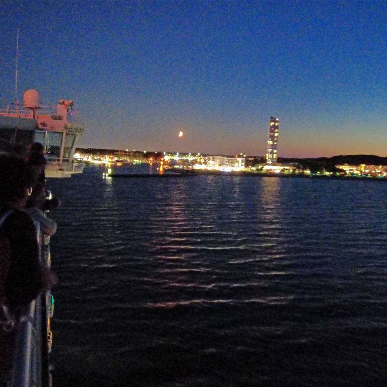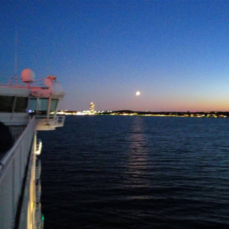In Travemünde wollten wir auf den grossen Parkplatz wo ich schon mehrmals übernachtet hatte. Es war aber alle überstellt mit Fahrzeugen von Ausstellern. Travemünde hatte ein wöchiges Fest. Ab heute wurde alles wieder Rückgebaut was entsprechend Verkehr brachte. Ich kannte noch einen neuen Stellplatz auf der anderen Seite der Stadt. Dort konnten wir parkieren. Wir wollten ja nicht Schlafen sondern musste noch später zum Schiff fahren. Zu Fuss ging es in die Stadt zurück. Wir schauten noch ein wenig die verschiedenen kleinen Geschäfte an und gingen anschliessend zum Abendessen in ein Fischrestaurant. Die Zeit lief, sodass wir uns langsam auf den Weg zur Fähre machen mussten. Gegen 23.30 Uhr haben wir eingecheckt. Wir mussten noch bis um 01.00 Uhr warten bis wir auf die Fähre konnten. Nach dem Bezug der Kabine schliefen wir schnell ein.